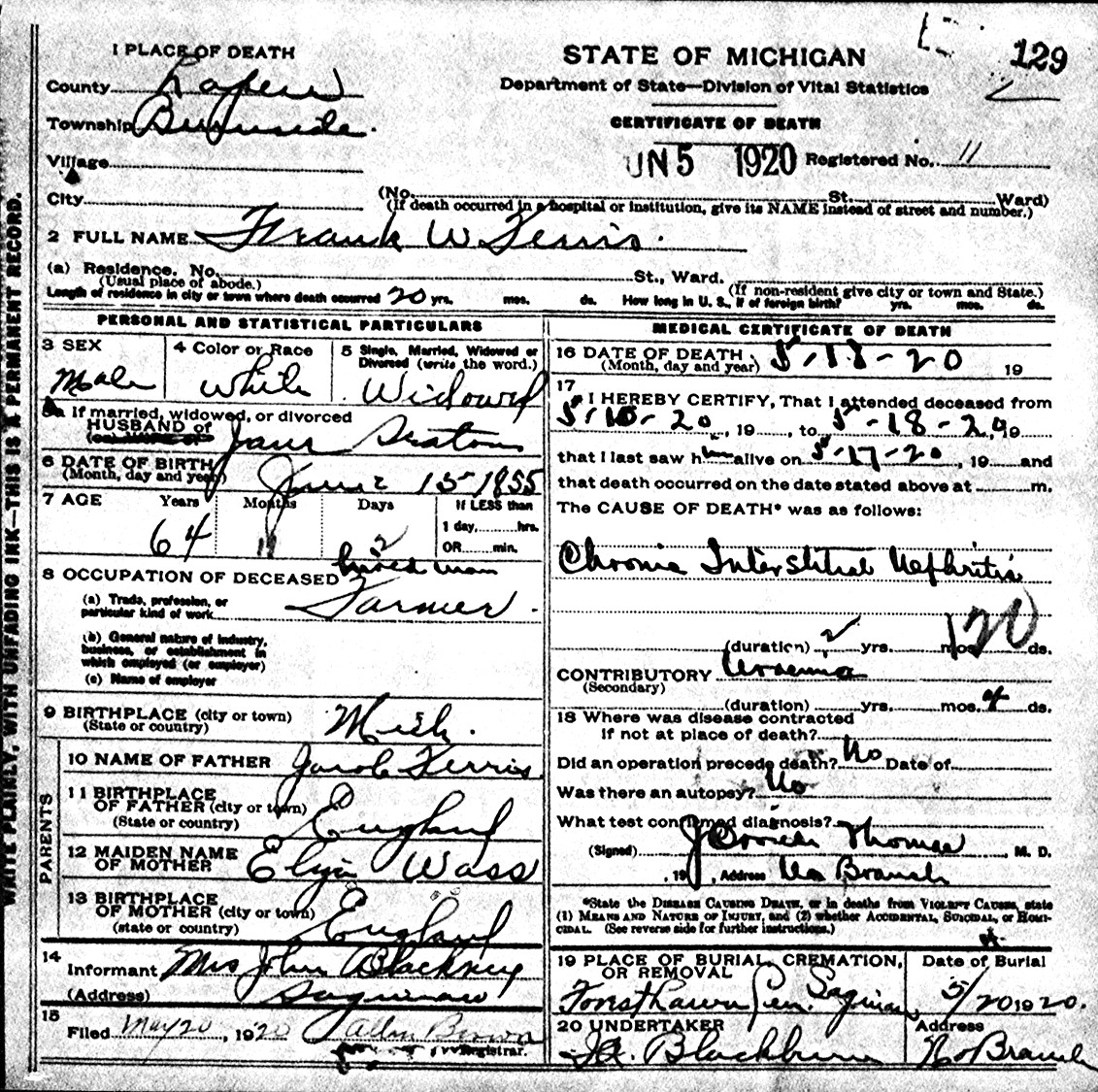 Francis W. "Frank" Ferris died May 18, 1920, in Burnside Twp., Lapeer Co., MI, at age 64. Buried in Forest Lawn Cemetery, Saginaw, Lapeer Co., MI.