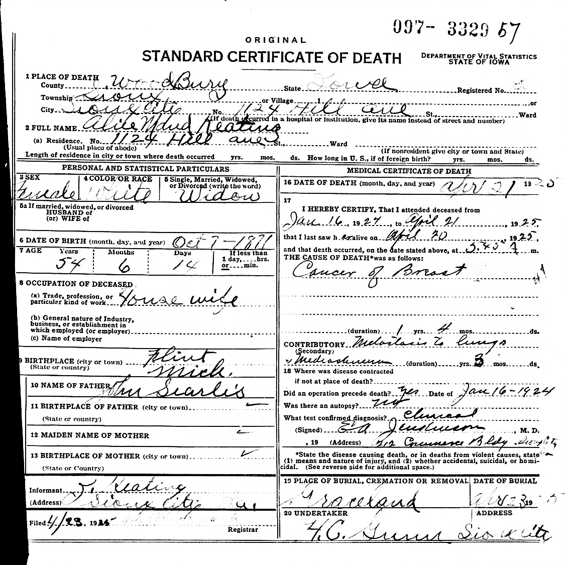 Alice Maud "Allie" (Keating) Keating died April 21, 1925, at her home, 1124 Hill Avenue, Sioux City, Woodbury Co., IA, at age 53. Buried in Graceland Park Cemetery, Sioux City, Woodbury Co., IA.