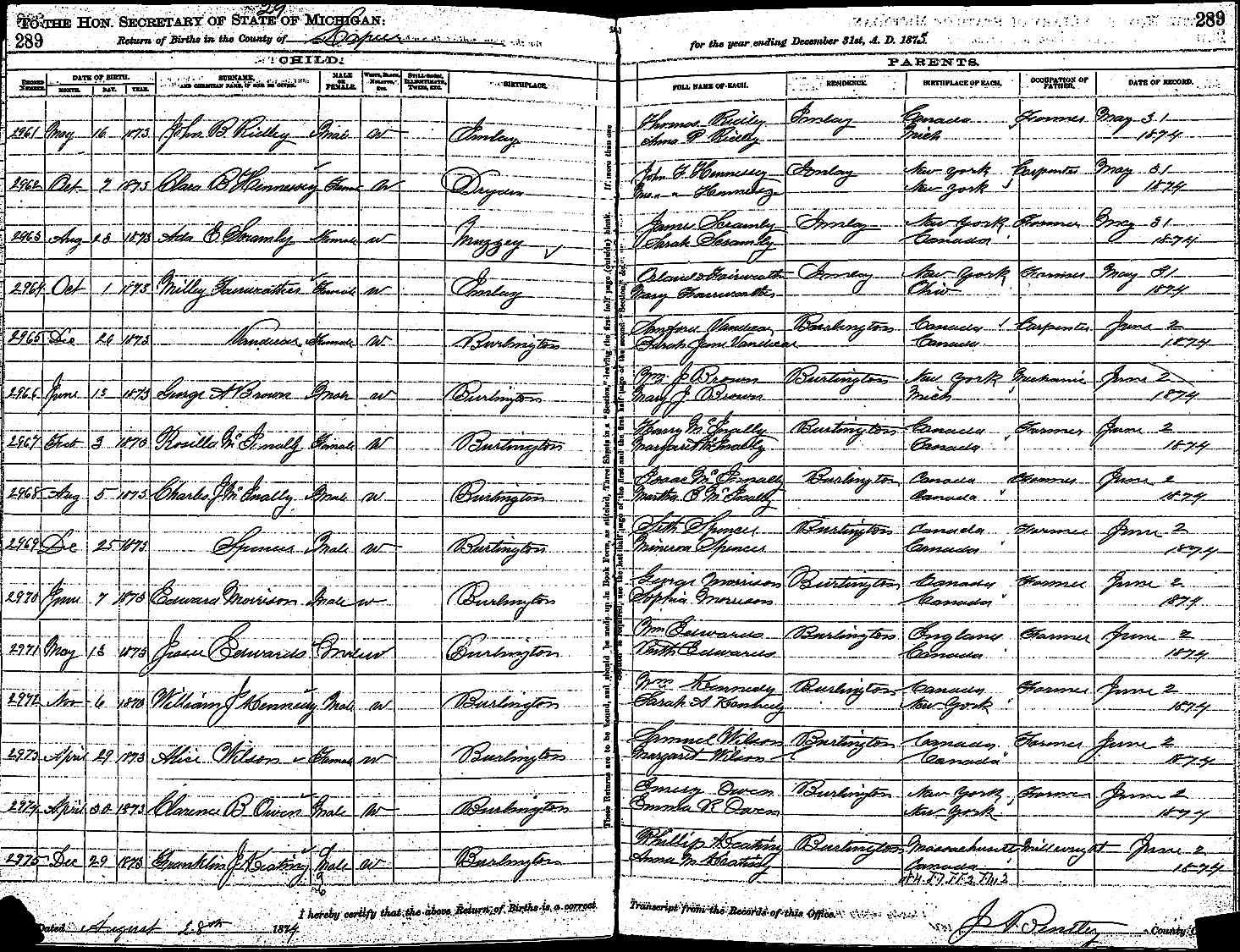 The 1880 U. S. Census dated June 14, 1880, shows Alfred Seaton (age 53) born in Canada to New York and Canadian-born parents is Widowed or Divorced Farmer and is living in Burnside Twp., Lapeer Co., MI. Living with him are his 7 unmarried children, all born to Canadian-born parents: Jane Seaton (age 25) born in Canada, a Domestic Servant; Arletta Seaton (age 23) born in Canada, who is Keeping House; Wilson Seaton (age 21) born in Canada; Anthony Seaton (age 19) born in Canada, a Labourer; Henery Seaton (age 17) born in Michigan; Roswell Seaton (age 13) born in Michigan; and John Seaton (age 9) born in Michigan.