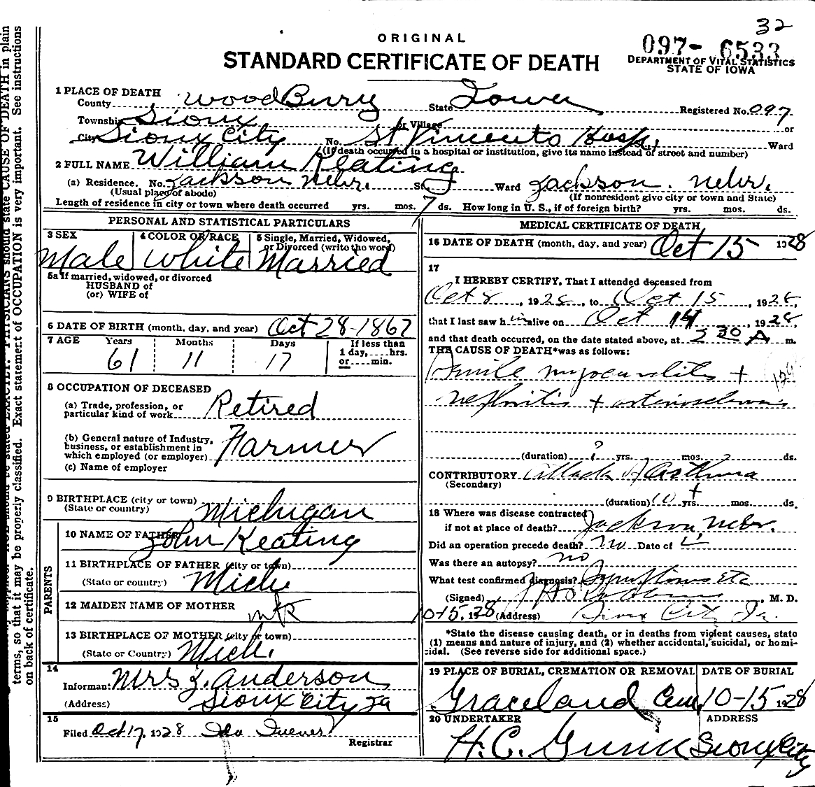 William George "Will" Keating died October 13, 1928, at St. Vincent's Hospital, Sioux City, Sioux Twp., Woodbury Co., IA , at age 61. Buried in Graceland Park Cemetery, Sioux City, Woodbury Co., IA.