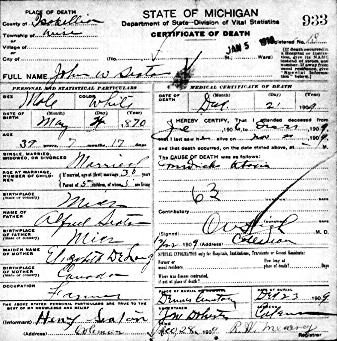 John W. Seaton was born May 1, 1870, in Burnside Twp., Lapeer Co., MI.