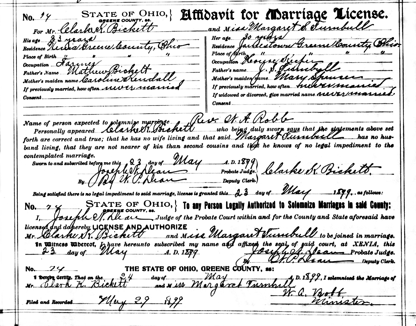 Clark Kendall Bickett and Margaret Susannah Turnbull were married May 25, 1899, in Xenia, Greene Co., OH.