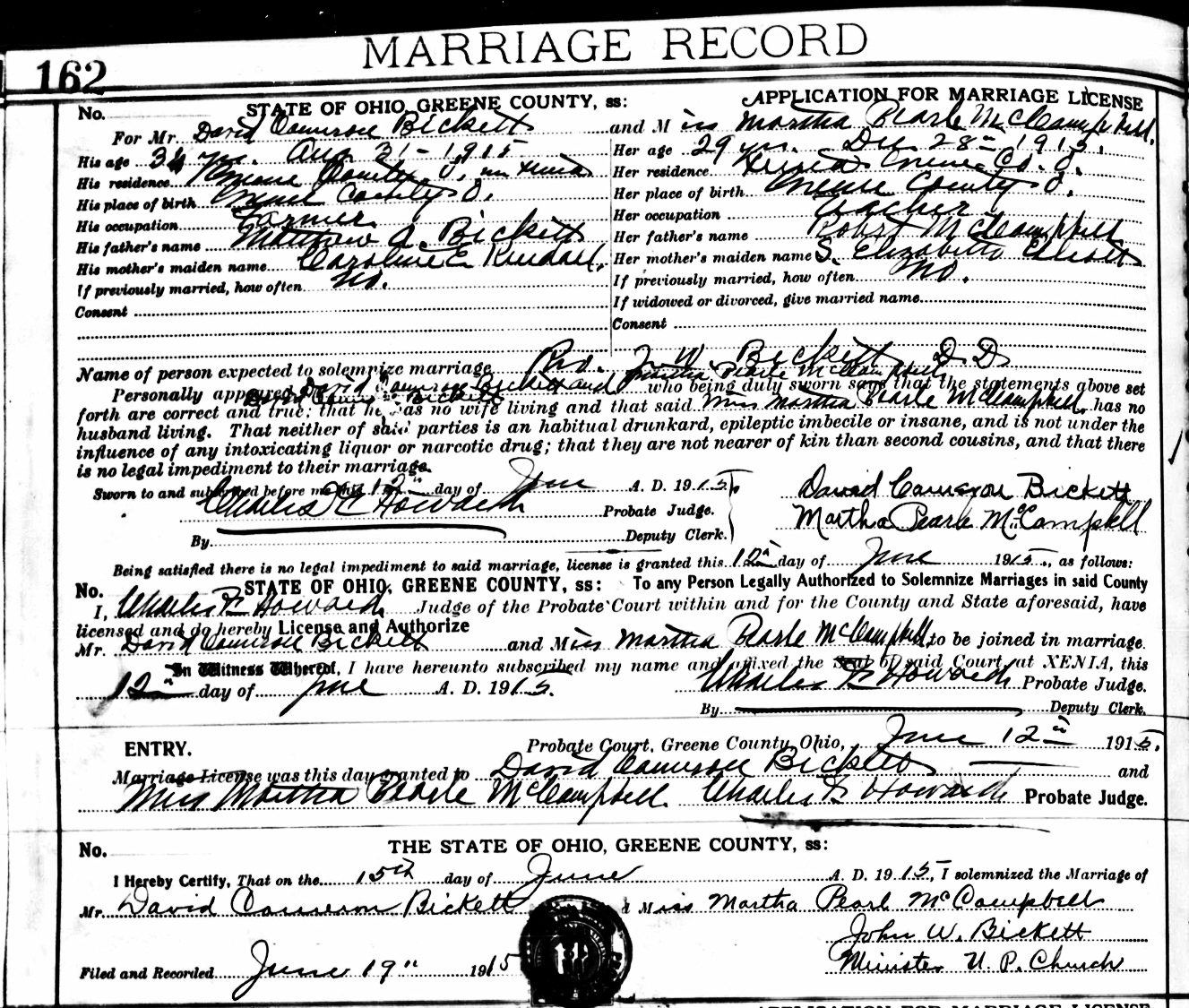 David Cameron Bickett and Martha Pearle McCampbell were married June 15, 1915, at the home of Mr. and Mrs. John McCampbell, Xenia, Greene Co., OH.
