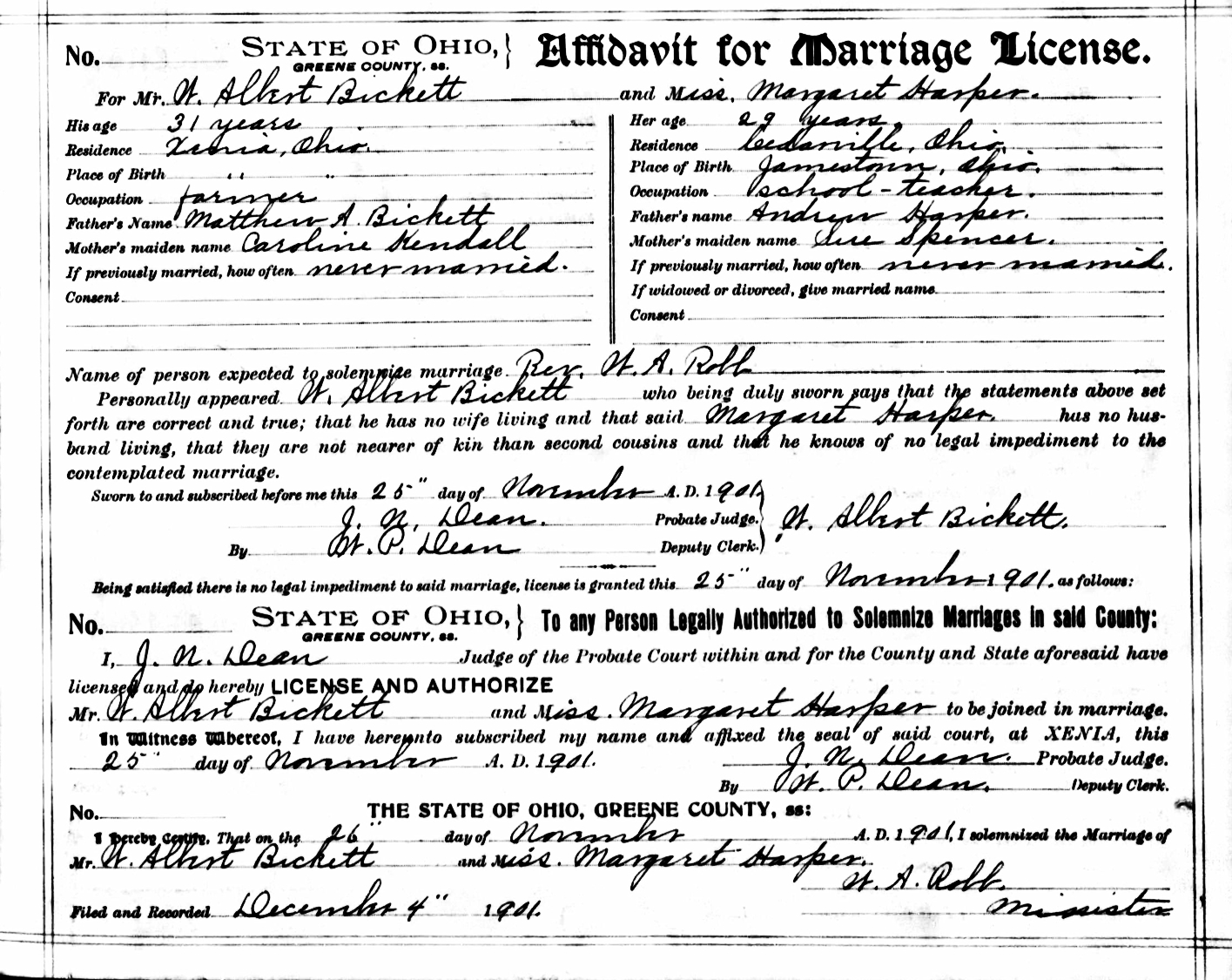 William Albert Bickett and Margaret Harper were married November 26, 1901, in Jamestown, Greene Co., OH.