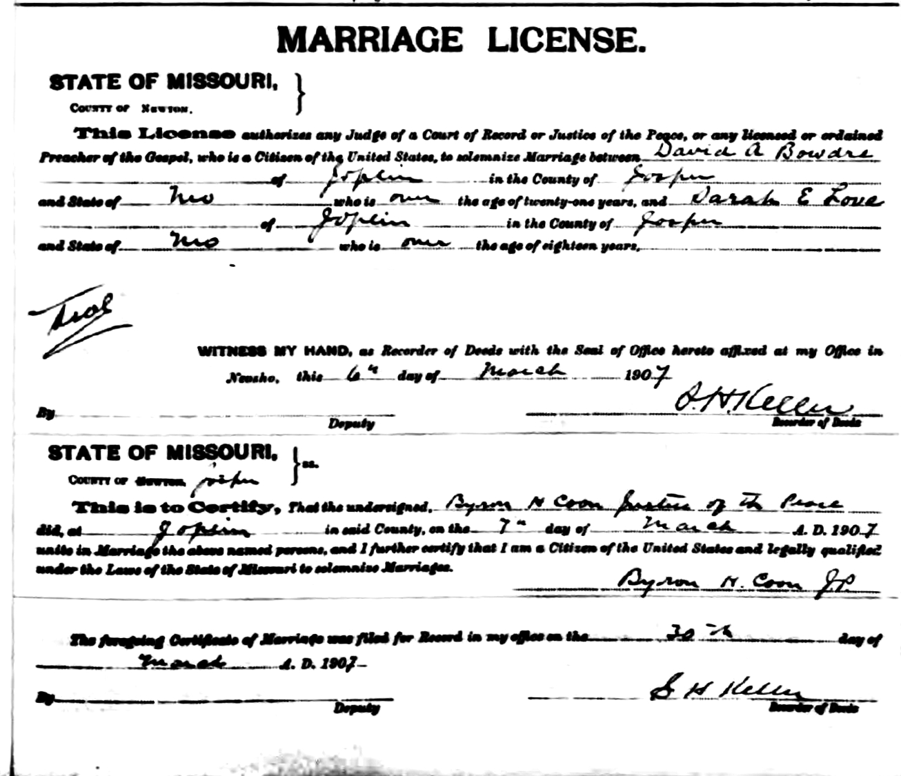 David A. Bowdre and Sarah E. (Frye) Love were married March 7, 1907, in Joplin, Jasper Co., MO.