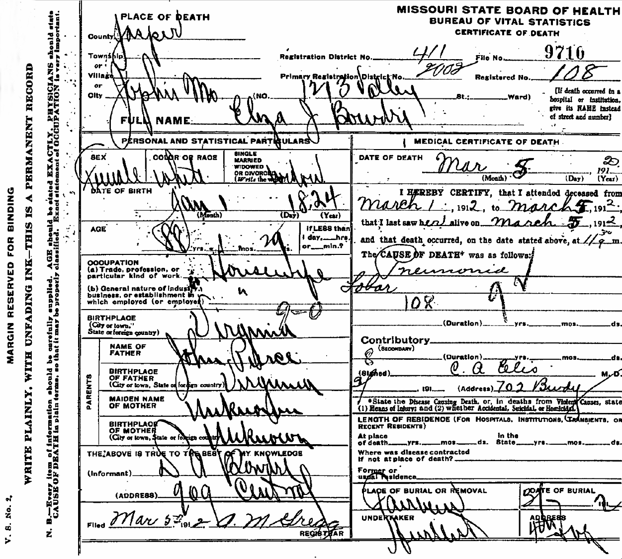 David A. Bowdre died March 10, 1929, at his home, Joplin, Jasper Co., MO, at about age 65. Buried in Fairview Cemetery, Joplin, Jasper Co., MO.