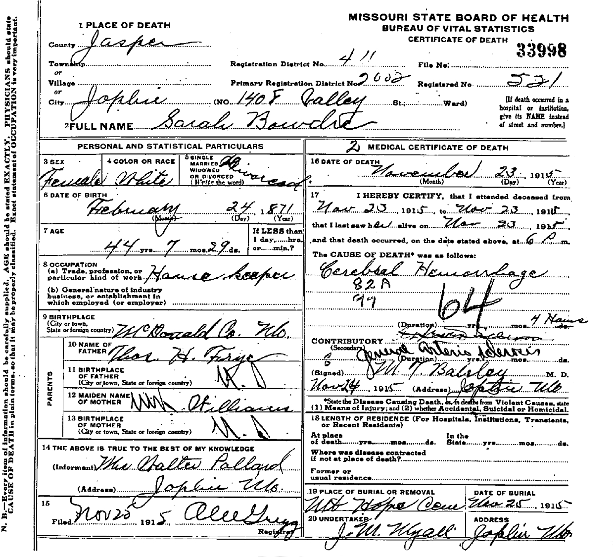 George W. Bowdre died April 24, 1925, at the his home of his brother, David, Joplin, Jasper Co., MO, at about age 64. Buried in Fairview Cemetery, Joplin, Jasper Co., MO.