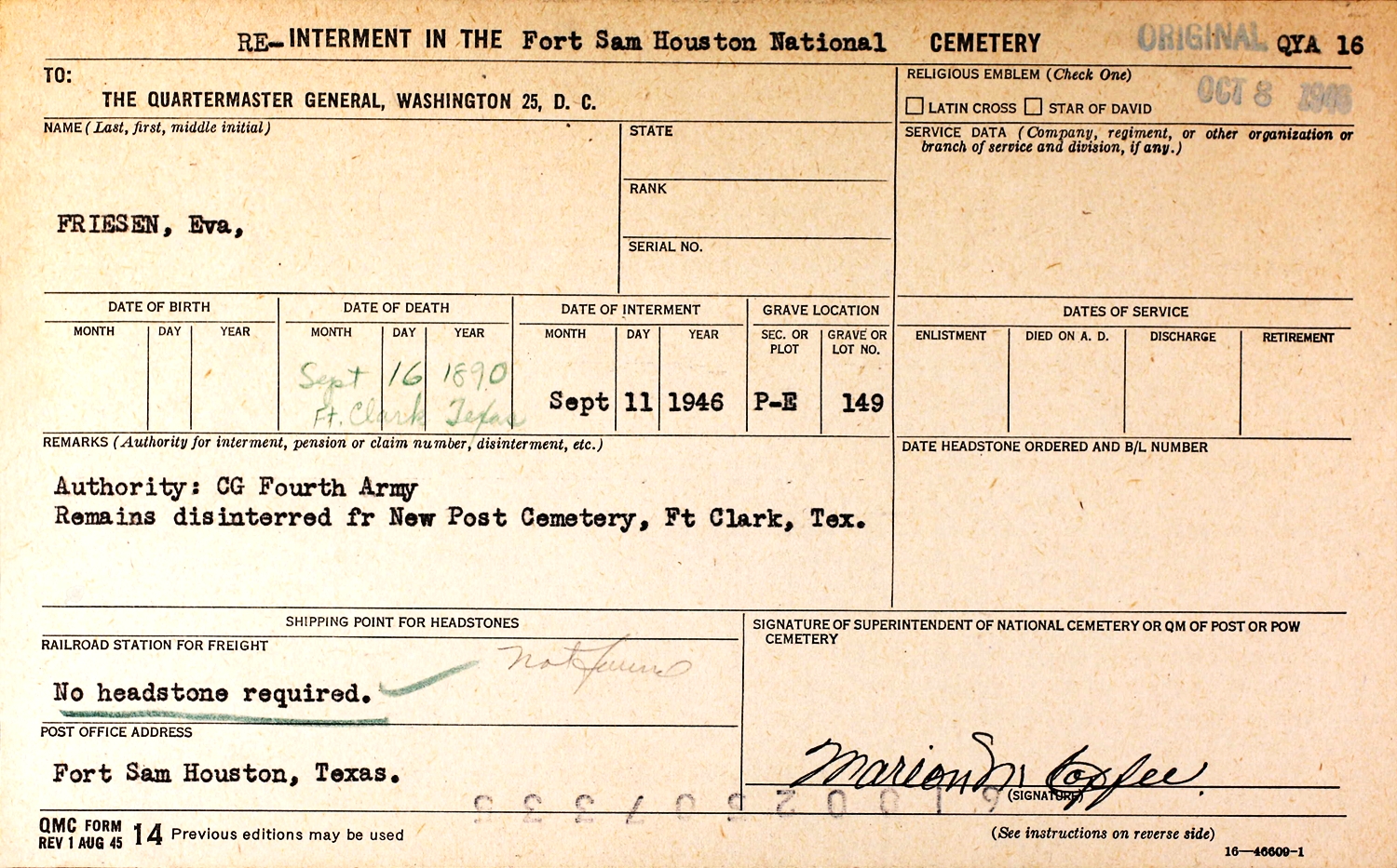 - Arthur Julius Friesen: Born July 10, 1883, in Fort Assiniboine, Hill Co., MT; Died July 21, 1958, in San Antonio, Bexar Co., TX (age 75). Buried in Fort Sam Houston National Cemetery, San Antonio, Bexar Co., TX. Married to Marie Louise Eisele: Born May 7, 1900, in San Antonio, Bexar Co., TX; Died May 23, 1950, at Santa Rosa Hospital, San Antonio, Bexar Co., TX (age 50). Buried in Fort Sam Houston National Cemetery, San Antonio, Bexar Co., TX.