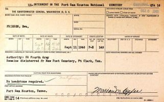 - Edwin Randolph "Eddie" Friesen: Born August 10, 1889, at Fort Lyon, near Las Animas, Bent Co., CO; Died January 12, 1967, at Gulf Coast Hospital, Baytown, Harris Co., TX (age 77). Buried in Roselawn Cemetery, in San Antonio, Bexar Co., TX. Adopted by Charles J. Norbery (First Sergeant, U. S. Army; Born September, 1840, in Copenhagen, Denmark; Died January 26, 1905, in San Antonio, Bexar Co., TX, at age 64 . Buried in San Antonio National Cemetery, San Antonio, Bexar Co., TX). Married to Zena Irene Johnson: Born July 20, 1893, in Rock Springs, Edwards Co., TX; Died April 22, 1961, in San Antonio, Bexar Co., TX (age 67). Buried in Roselawn Memorial Park, in San Antonio, Bexar Co., TX. Anna Marie Kalt was born January 16, 1859, in Switzerland, and died September 4, 1924, in San Antonio, Bexar Co., TX at age 65. Frederick Imhof and Anna Maria (Kalt) Norbery were married February 27, 1906, in San Antonio, Bexar Co., TX. Buried in San Antonio National Cemetery, San Antonio, Bexar Co., TX.