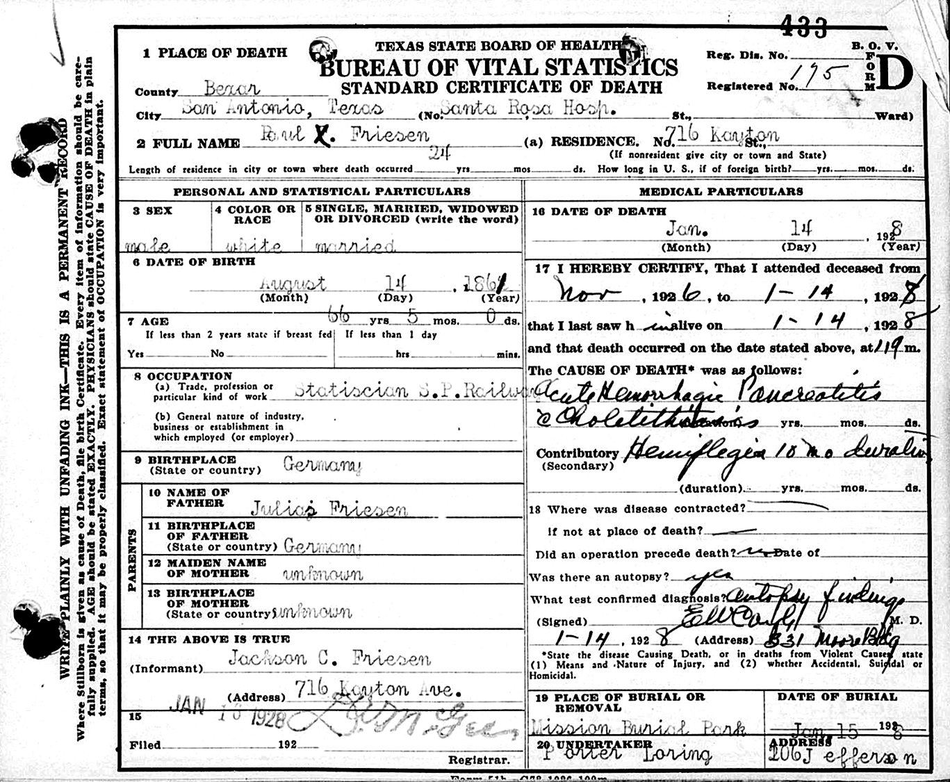 Paul Friesen died January 14, 1928, in San Antonio, Bexar Co., TX, at age 66. Buried in Mission Burial Park, San Antonio, Bexar Co., TX.