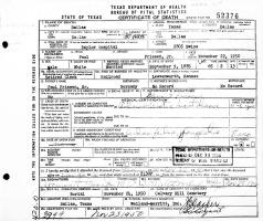 Catherine (Cates) Friesen died June 28, 1962, in San Antonio, Bexar Co., TX, at age 81. Buried in Mission Burial Park, San Antonio, Bexar Co., TX.