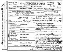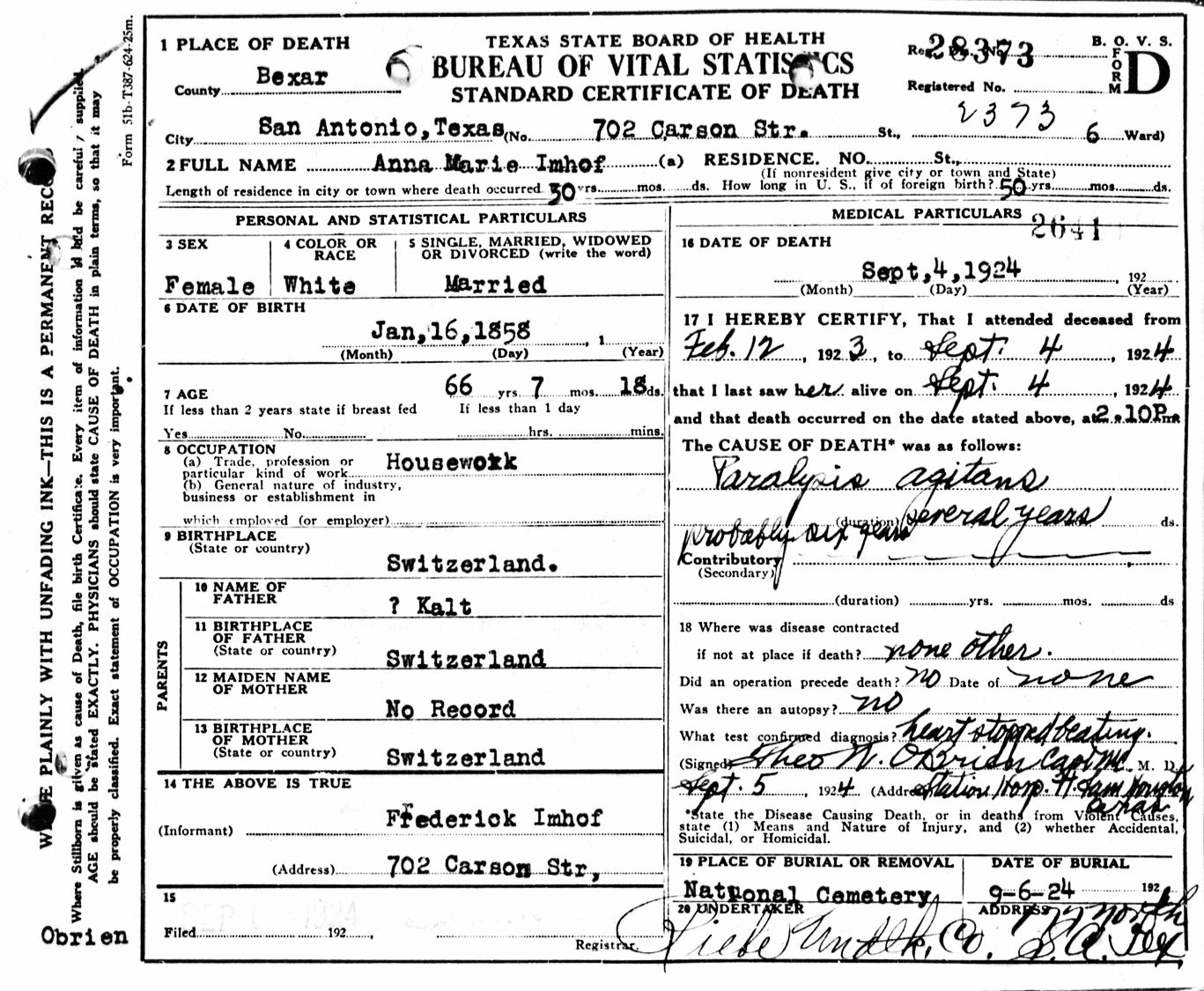 Anna Marie (Kalt) (Norbery) Imhof died September 4, 1924, at her home, San Antonio, Bexar Co., TX, at age 66. Buried in San Antonio National Cemetery, San Antonio, Bexar Co., TX.