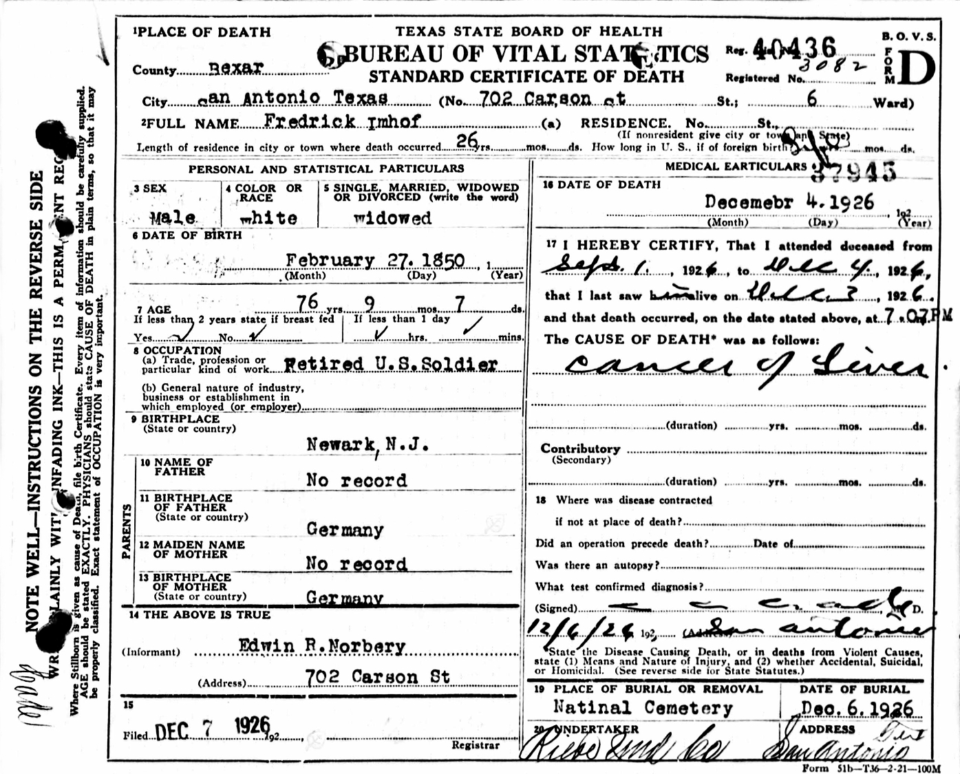 Frederick "Fred" Imhof died December 4, 1926, in San Antonio, Bexar Co., TX, at age 76. Buried in San Antonio National Cemetery, San Antonio, Bexar Co., TX.