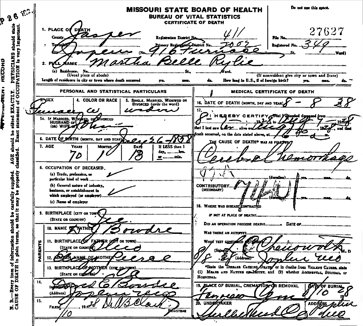 Martha Isabella "Belle" (Bowdre) Rylie died August 8, 1928, at the home of her brother, David, in Joplin, Jasper Co., MO, at age 70. Buried in Fairview Cemetery, Joplin, Jasper Co., MO. She was a widow living in Joliet, IL, in 1900. She married in 1901 in Joplin, MO, to a widower, John Riley (born June, 1858, in Orange Co., OH, and was killed by inmates on November 23, 1909, at the state asylum at Nevada, MO, from injuries sustained from another inmate, and buried in Shoal Creek Cemetery, Steelville, Crawford Co., MO). John was married at age 21 to Ridlay Barnes. He separated from Ridlay in 1891, at Webb City, MO.