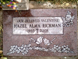Hazel Alma (Williams) (McCrea) (Jones) Rickman died February 9, 2008, in Flagstaff, Coconino Co., AZ, at age 72.