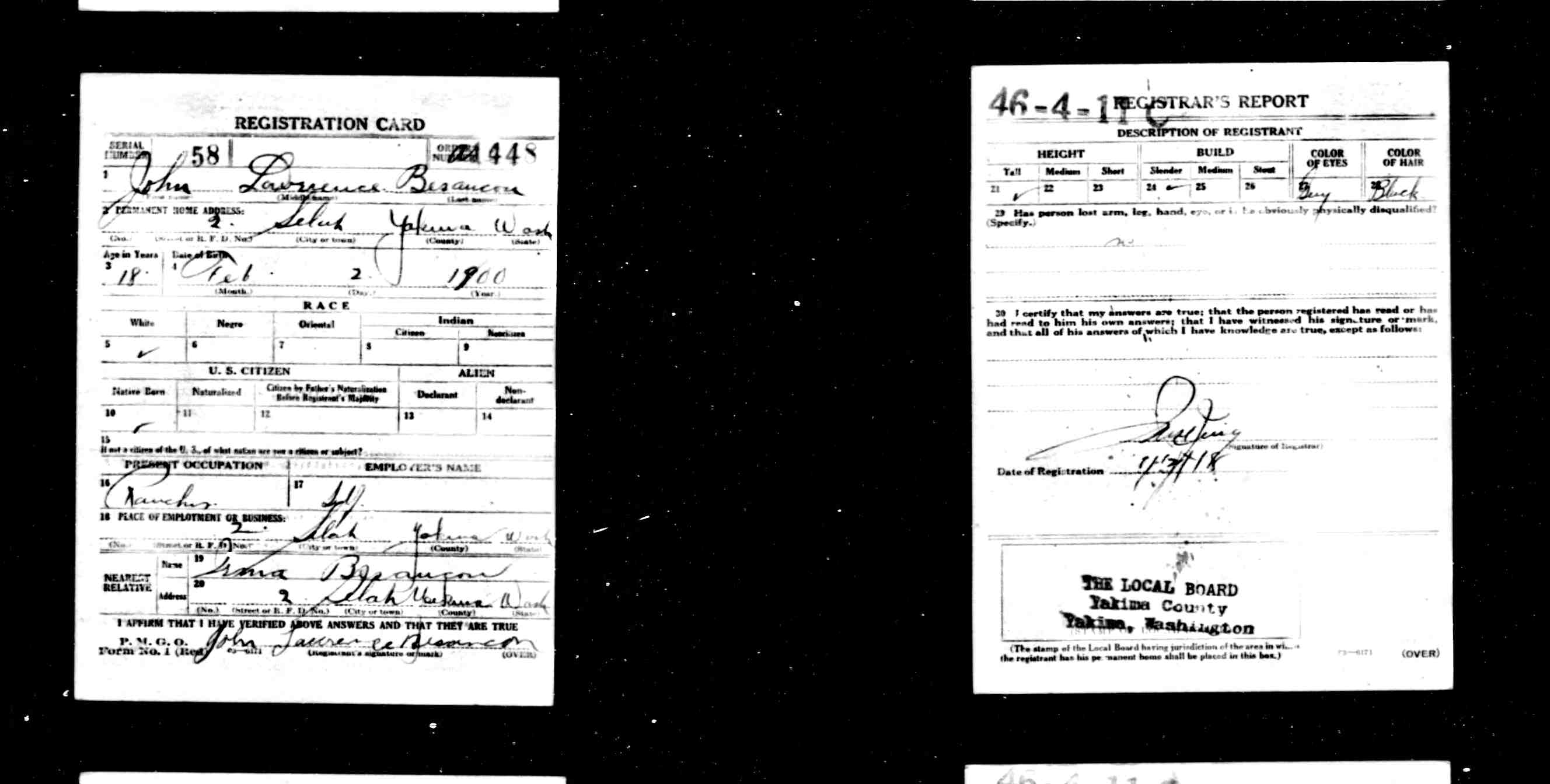 The WWI Draft Registration Form taken on September 12, 1918, shows John Lawrence Besancon shows he is a Rancher born February 2, 1900, and living at RFD 2, Selah, Yakima Co., WA. He is living with Irma Besancon.