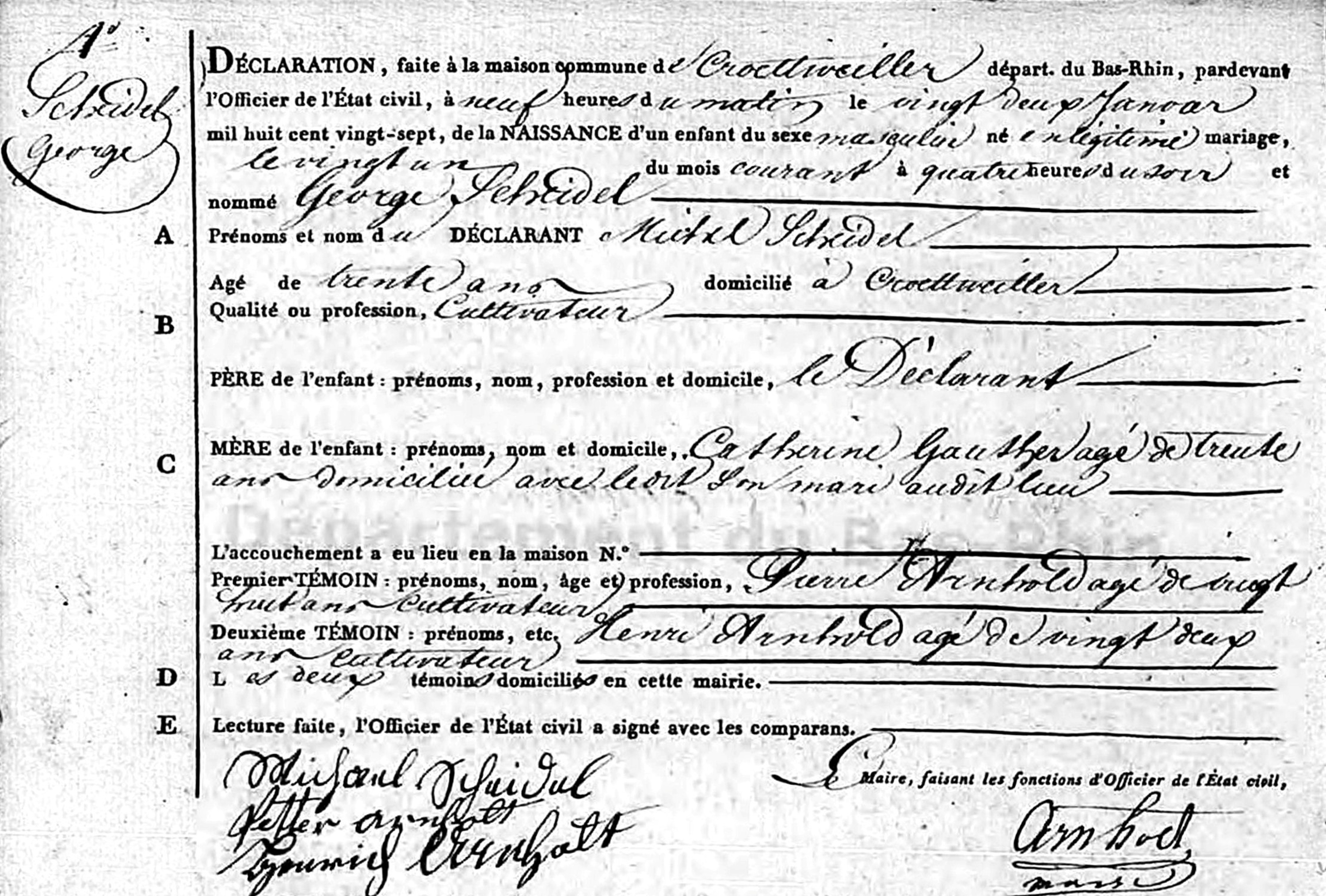 George Scheidel was born January 22, 1827, in the Village of Croettwiller, Croettwiller, Bas-Rhin, Grand Est, Alsace, France.