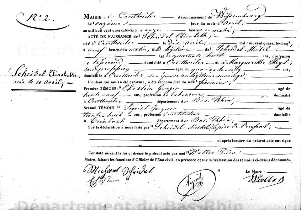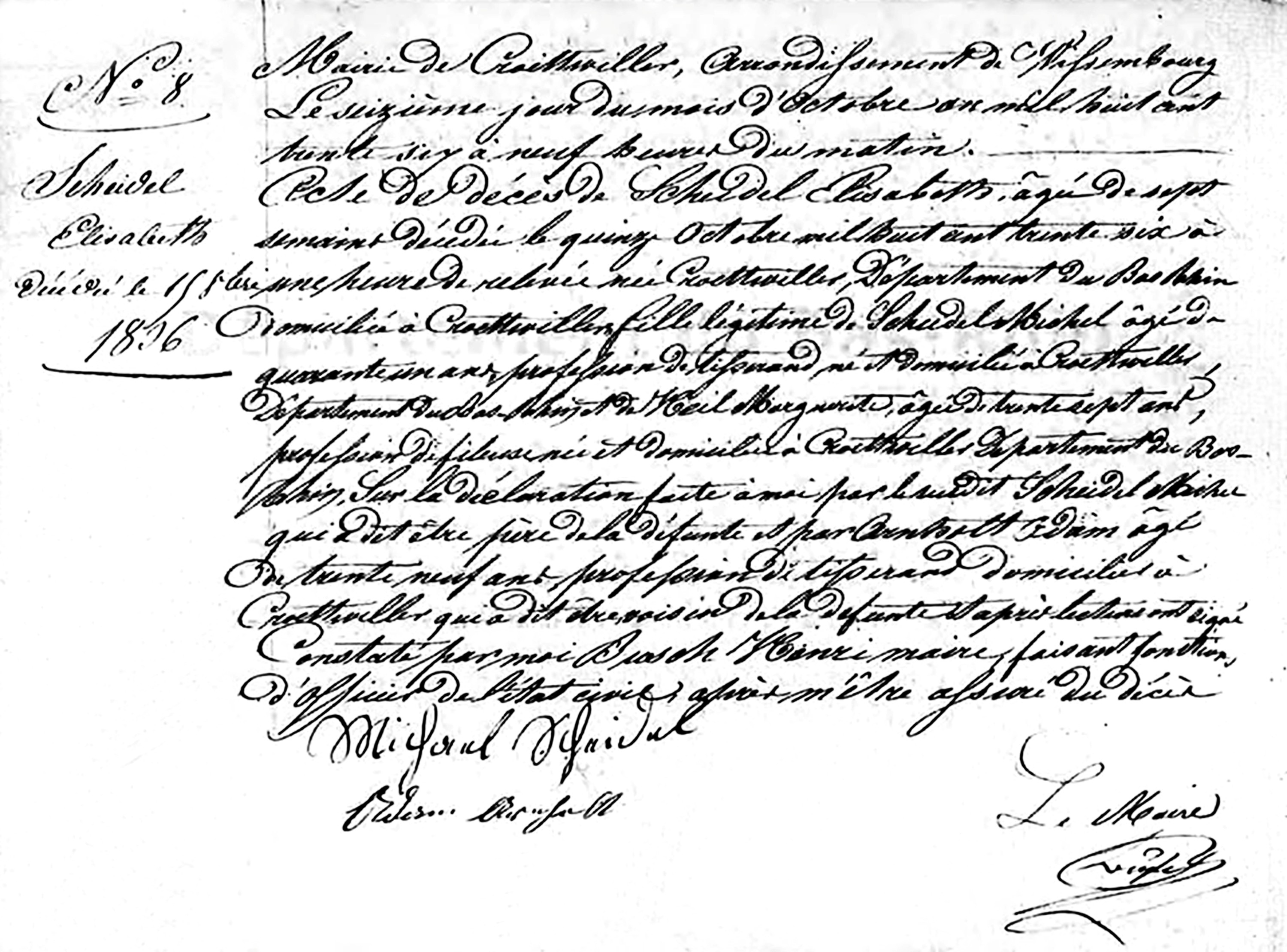 - Elisabeth Scheidel: Born August 28, 1836, in the Village of Croettwiller, Croettwiller, Bas-Rhin, Grand Est, Alsace, France; Died October 16, 1836 , in the Village of Croettwiller, Croettwiller, Bas-Rhin, Grand Est, Alsace, France (age Infant).