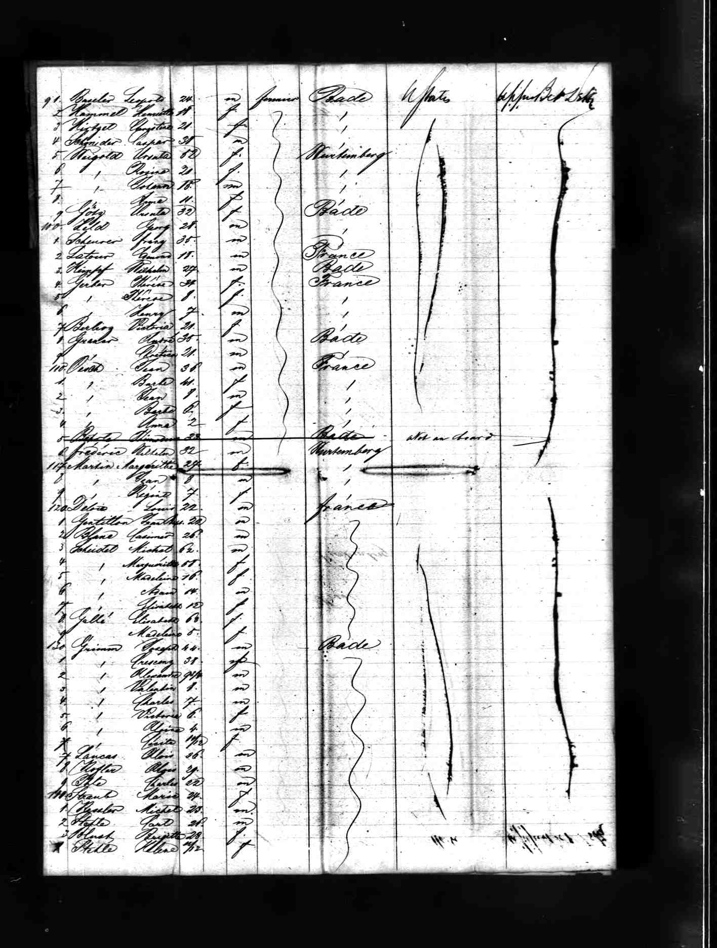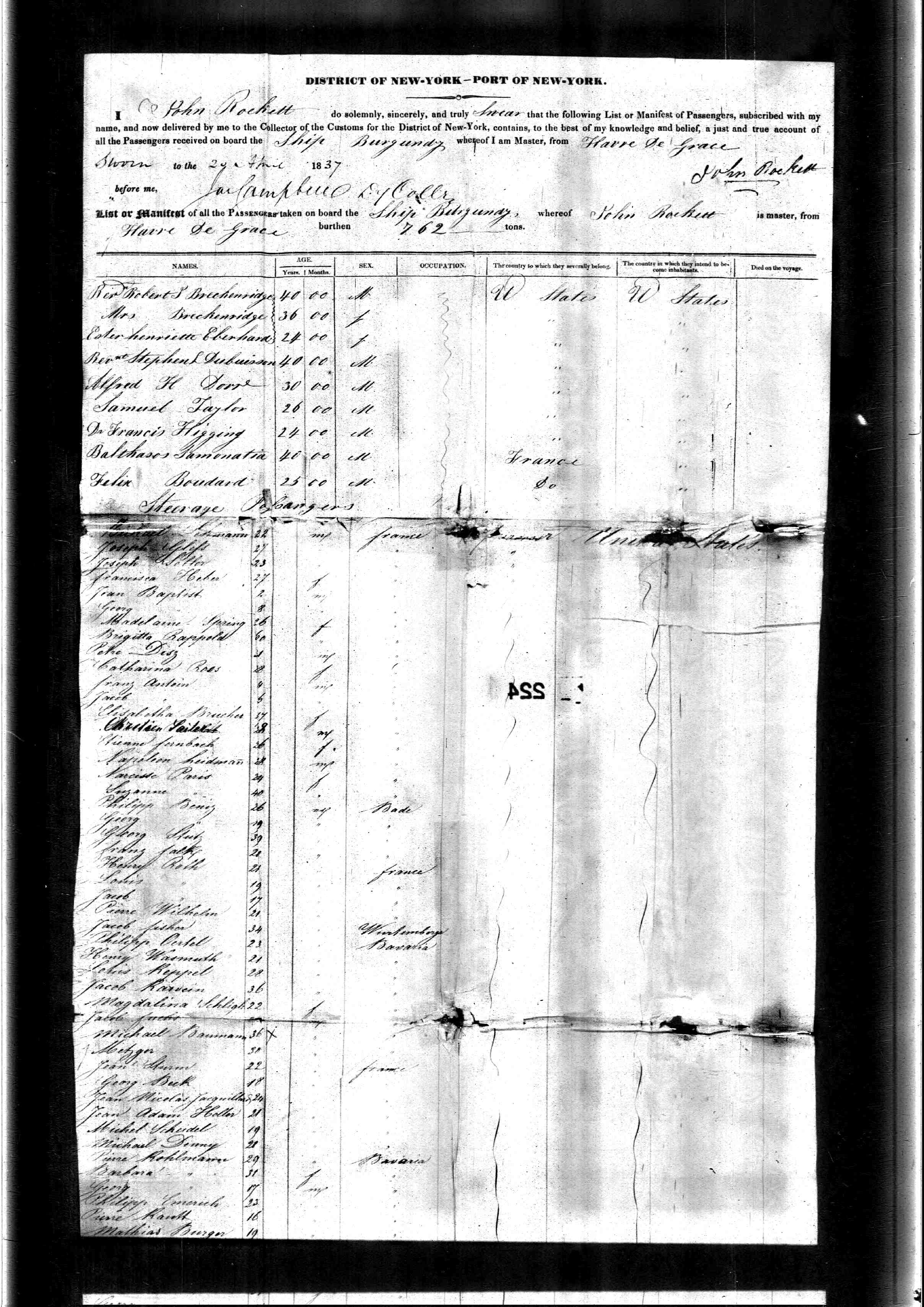 Michel Scheidel (age 19), a Farmer, departed April 20, 1837, from Havre De Grace, aboard the Ship Burgundy, and arrived April 20, 1837, in the Port of New York.