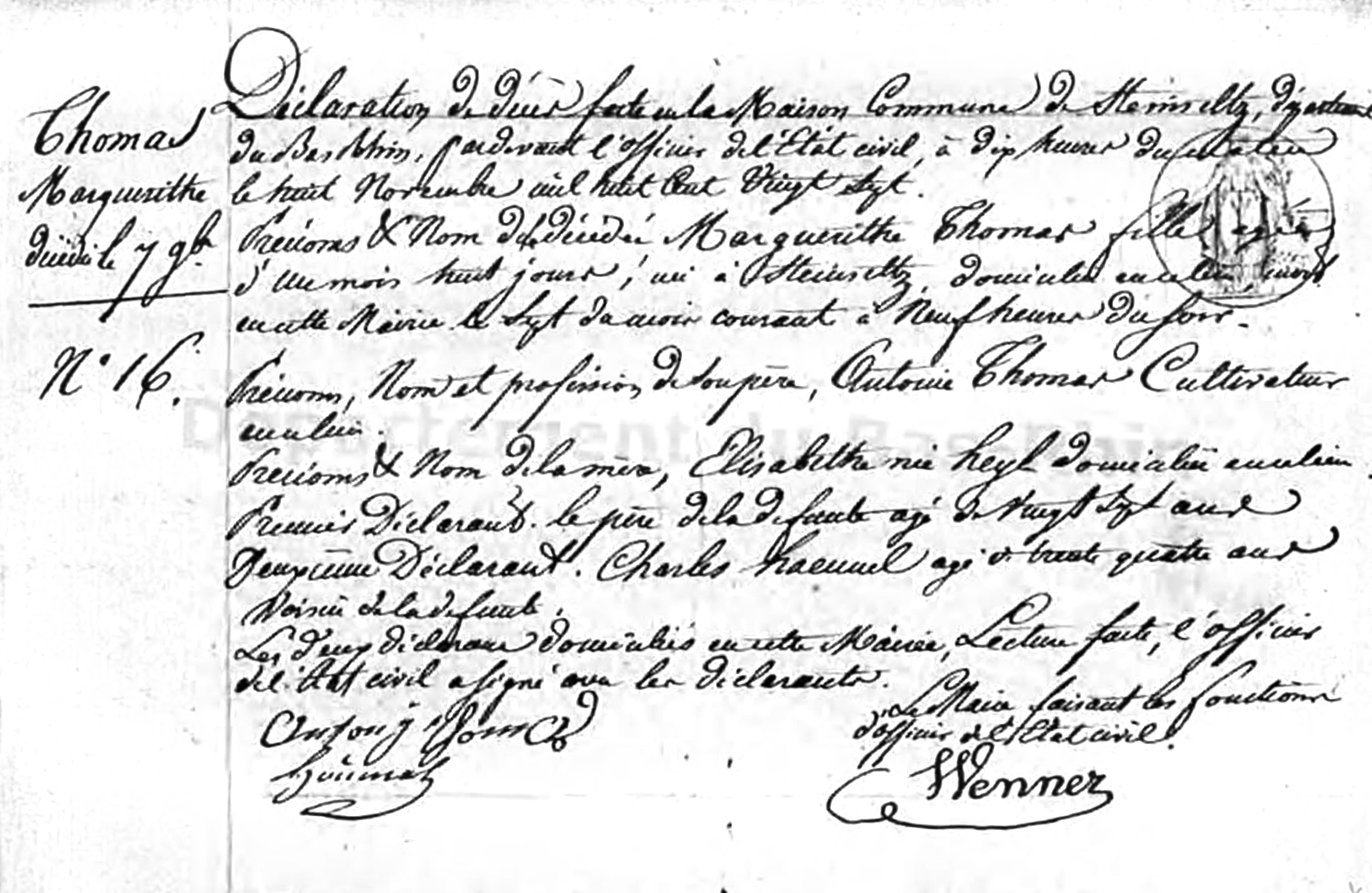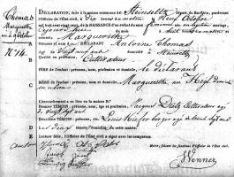 - Marguerithe Thomas: Born October 9, 1827, in Steinseltz, Bas-Rhin, Grand Est, Alsace, France; Died November 8, 1827, in Steinseltz, Bas-Rhin, Grand Est, Alsace, France (age Infant).