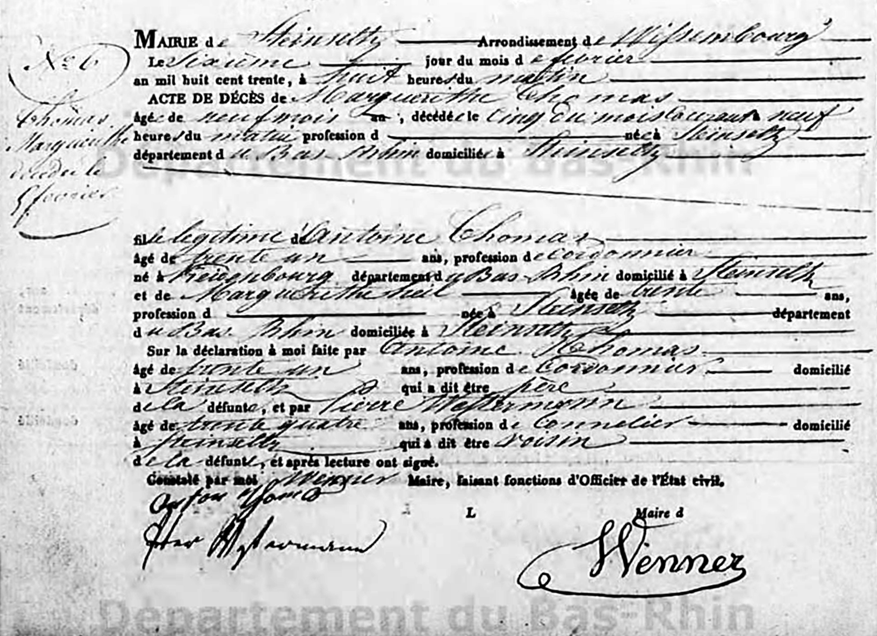 - Marguerithe Thomas: Born April 7, 1829, in Steinseltz, Bas-Rhin, Grand Est, Alsace, France; Died February 6, 1830, in Steinseltz, Bas-Rhin, Grand Est, Alsace, France (age Infant).