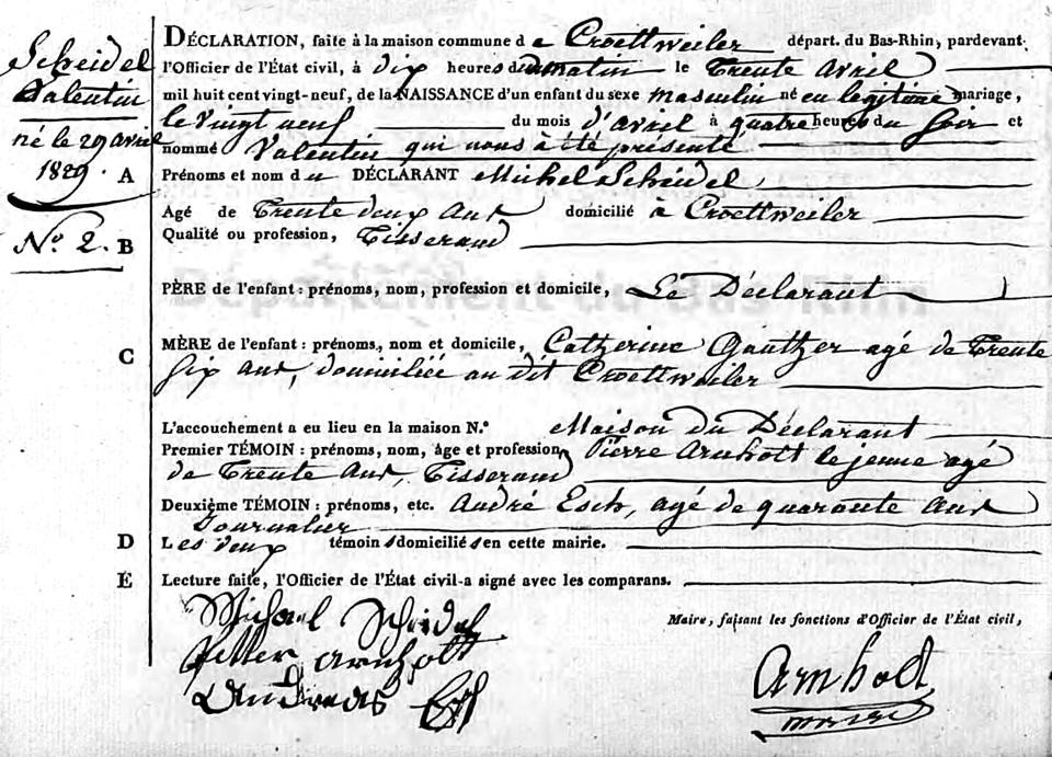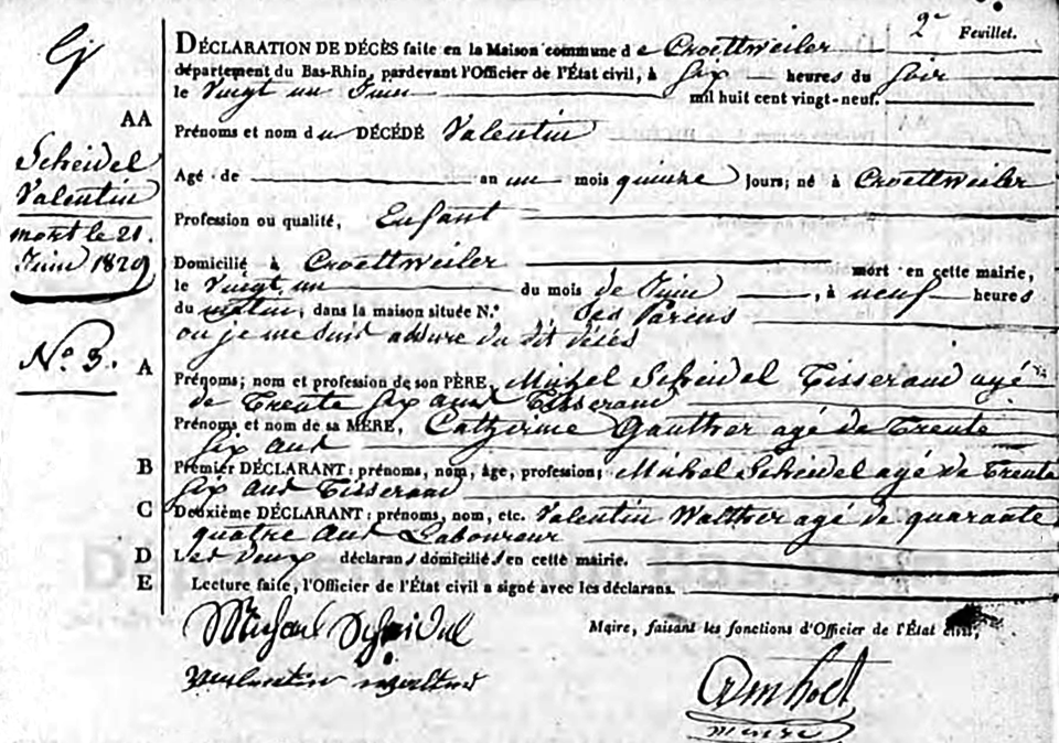 - Valentin Scheidel: Born April 30, 1829, in the Village of Croettwiller, Croettwiller, Bas-Rhin, Grand Est, Alsace, France; Died June 21, 1829, in the Village of Croettwiller, Croettwiller, Bas-Rhin, Grand Est, Alsace, France (age Infant).