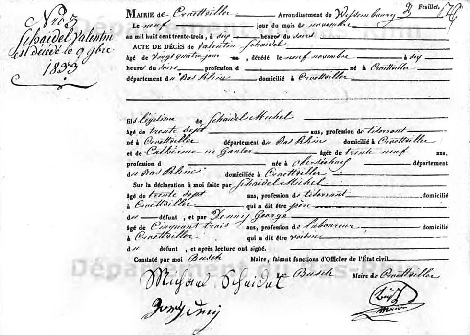 - Valentin Scheidel: Born October 16, 1833, in the Village of Croettwiller, Croettwiller, Bas-Rhin, Grand Est, Alsace, France; Died November 9, 1833, in the Village of Croettwiller, Croettwiller, Bas-Rhin, Grand Est, Alsace, France (age Infant) .