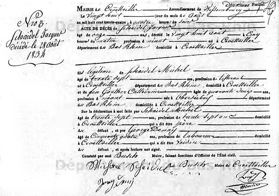 Jacques Scheidel died August 28, 1834, in the Village of Croettwiller, Croettwiller, Bas-Rhin, Grand Est, Alsace, France, at age 1.