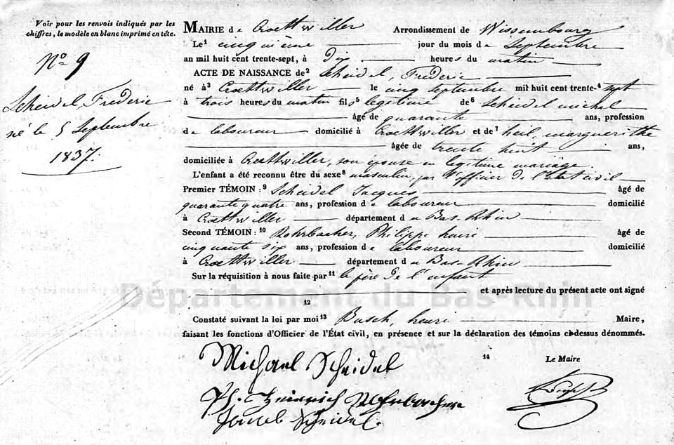 Frederic Scheidel was born September 5, 1837, in the Village of Croettwiller, Croettwiller, Bas-Rhin, Grand Est, Alsace, France.