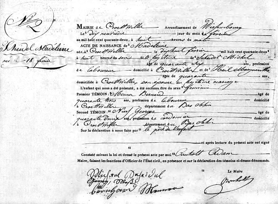Madeleine Scheidel was born February 19, 1842, in the Village of Croettwiller, Croettwiller, Bas-Rhin, Grand Est, Alsace, France.
