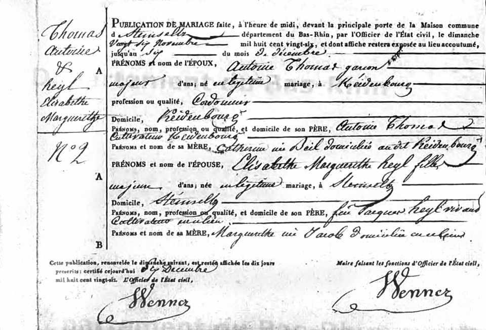 Antoine "Anthony" Thomas and Elisabethe Marguerithe "Margaret" Heil were married November 26, 1826, in Steinseltz, Bas-Rhin, Grand Est, Alsace Region, France .