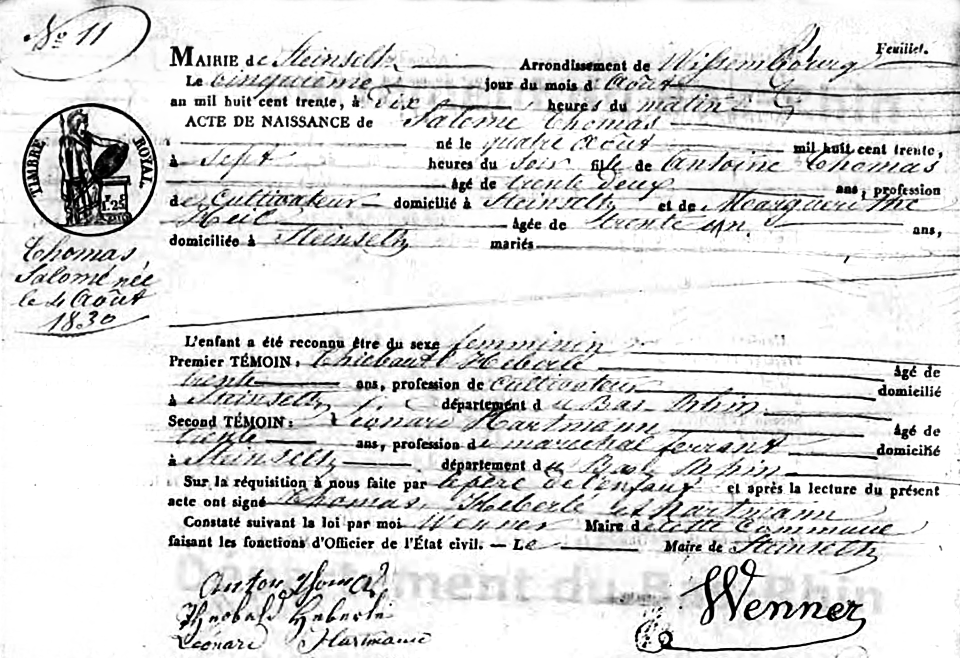 Salome Jane "Sarah" Thomas was born August 5, 1830, in Steinseltz, Bas-Rhin, Grand Est, Alsace, France .