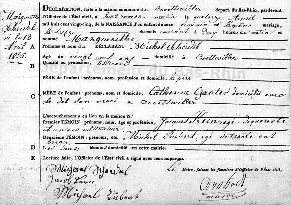 Marguerithe "Margaret" Scheidel was born April 13, 1825, in the Village of Croettwiller, Croettwiller, Bas-Rhin, Grand Est, Alsace, France.