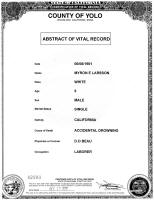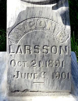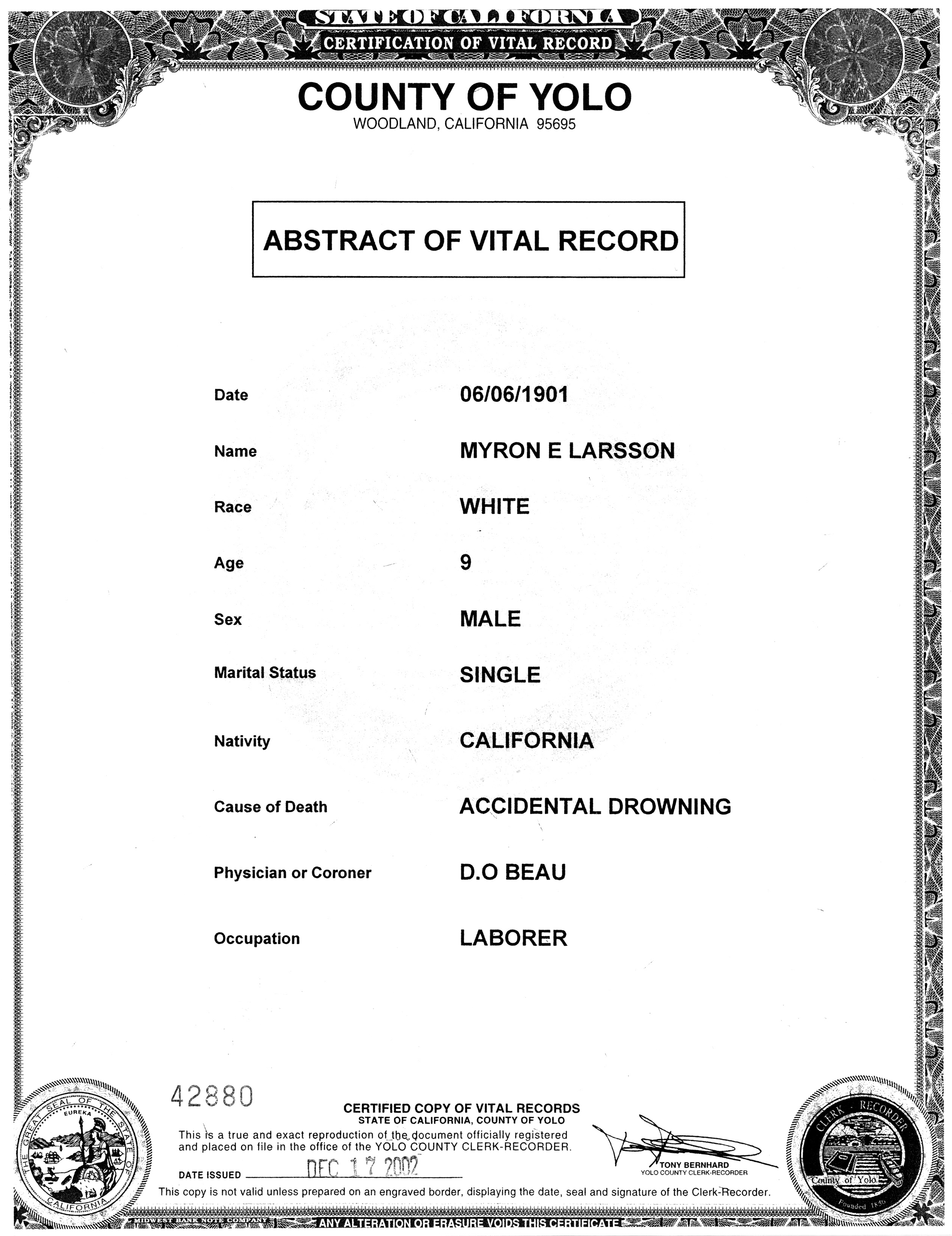 Myron Emerick Larsson died June 6, 1901, in Woodland, Yolo Co., CA, at age 9. Buried in Plot Block 20, Lot 3, Grave 2, in Woodland Cemetery, Woodland, Yolo Co., CA .