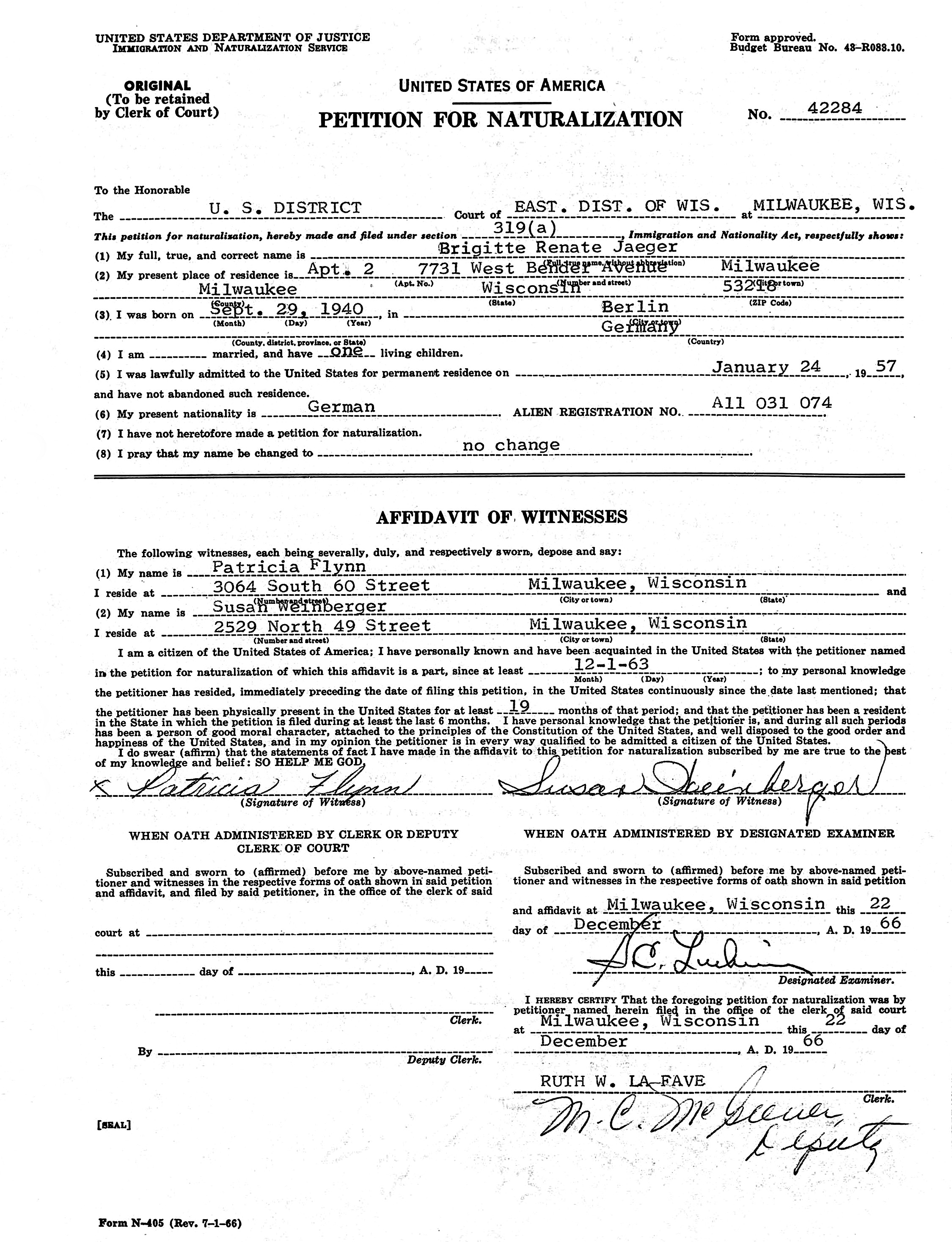 Brigitte Renate Felske petitioned for Naturalization on December 22, 1966, in Milwaukee, Milwaukee Co., WI.