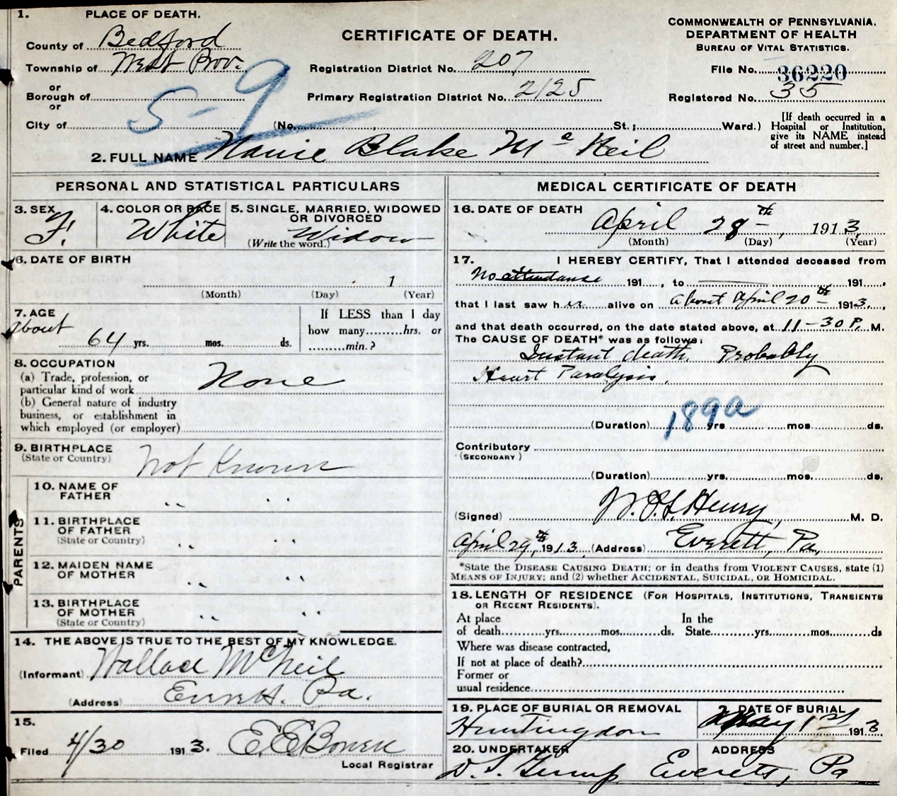 Nancy Lilly "Nannie" (Blake) McNeil died April 28, 1913, near Everett, Huntingdon Co., PA, at age 62.