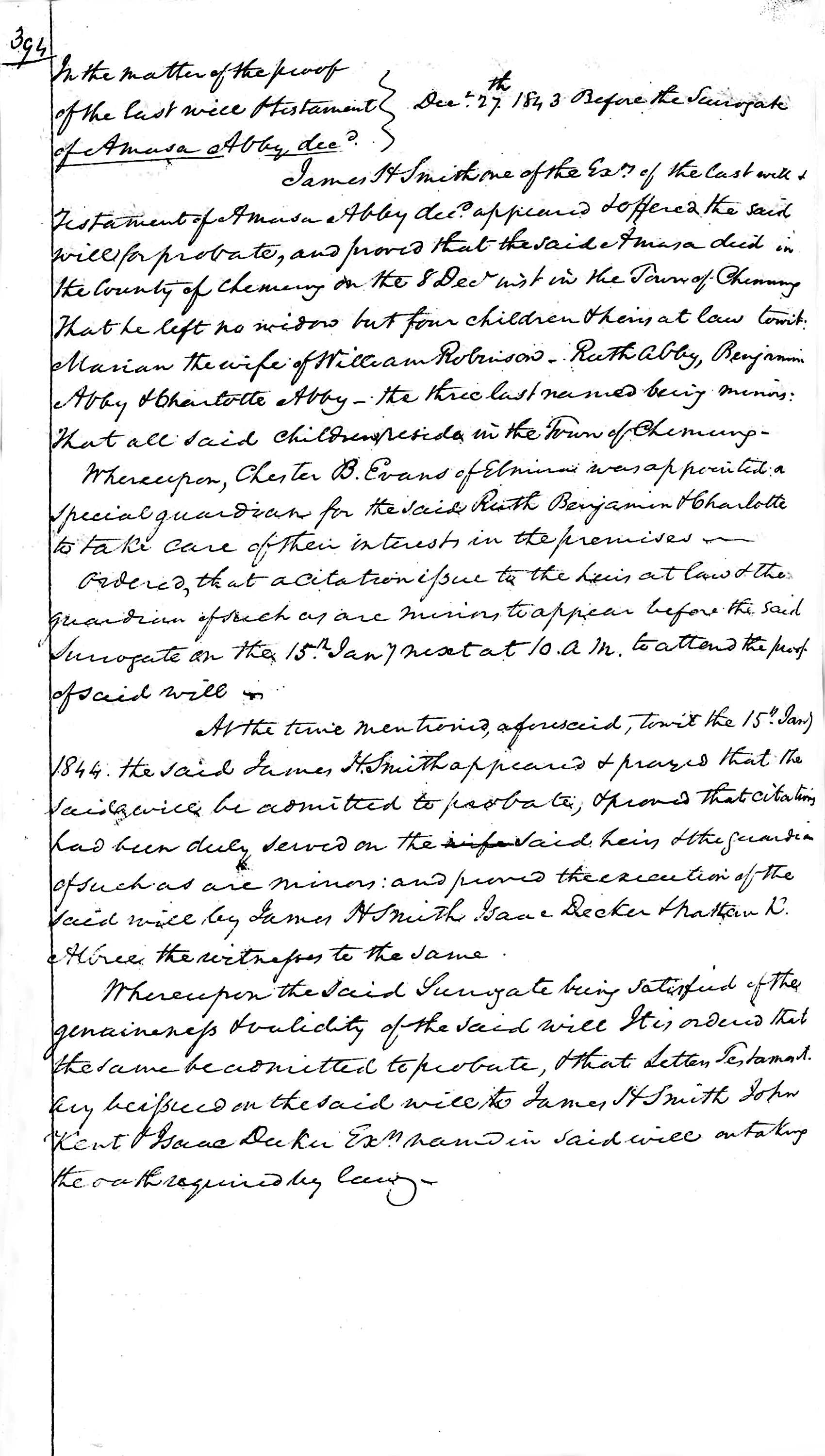 Amasa Abbey died December 8, 1843, in Chemung Twp., Chemung Co Co., NY, at about age 54.