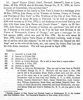Page 94 THE HAZEN FAMILY IN AMERICA 291 vi. Charlotte, b. 12 May 1778. 292 vii. George, b. 22 Sept. 1779, d. 24 Dec. 1783. 293 viii. Henry, b. 5 Jan. 1781, d. 11 Jan. 1781. 294 ix. LeBaron, b. 7 Apr. 1782. 295 X. Edwin, b. 5 Aug. 1783. 296 xi. George Henry, b. 27 Dec. 1784. 297 xii. A daughter, b. and d. 17 Mar. 1786. 296 xiii. Frances Amelia, b. 17 July 1787. 299 xiv. Frederick Edward, b. 22 Sept. 1788, d. 24 June 1790. 300 XV. Frederick Edward, b. 25 Dec. 1792, d. 8 Jan. 1825 [g. *.], 301 xvi. Sophia Ann, b. 5 Apr. 1796, d. 21 July 1812 [g. s.]. 111. John5 Hazen (John*, John3, Thomas2, Edward1), born at Lyme, Conn., 10 Feb. 1737/8, died at Minisink, Orange Co., N. Y., 1795; m. Anna Landon of Connecticut, who survived him.* The first evidence of this family in New York is found in a mortgage given 19 Nov. 1772 by John Hazen of the "Precinct of Goshen, County of Orange, and Province of New York" to Wm. Wickham of the City of New York, on a tract of land of about 98 acres in Warwick, "to be void on payment of £154 with interest on 19 Nov. 1773, in full discharge of one bond bearing even date with these from John Hazen and Joseph Hazen." Again, on 20 Mar. 1791, John Hazen of the Precinct of Goshen, etc., purchased "one half of lot no. 3 situated at the south end of lot no. 9 in the first west Division in the Patent of Wawayanda, County of Orange," and gave a mortgage for the full amount (�60), which was paid 16 Feb. 1796. By his will, dated 26 Mar. 1795, which begins "John Hazen of Minisink township, weak in body but of perfect mind and memory," he left to his "eldest son Samuel ten shil- lings" and to his wife all his lands, etc., and named his friend Paul Lee and his wife Anna, executors. The will was proved in April 1795. Children: 302 i. Samuel', b. 3 July 1765. 303 ii. Isaiah, b. 15 June 1768. 304 iii. Jeremiah, b. about 1771-3. 305 iv. John; m. Lizzie Stewart. He is said to have been a wagon maker. 306 v. Abraham, b. 4 Oct. 1777. 307 vi. Joseph, b. about 1783. 308 vii. Phebe; m. Michael Hendershot. They are said to have lived in Wallkill or Chester, Orange Co., N. Y. Michael's will was dated 11 Nov. 1786 and he left to his grandson Moses Moris a black mare and colt; all the rest of his estate was to be equally divided among his children: John Hendershot (said to have lived near Florida, N. Y., in 1820), Elizabeth Semen, Cateren [Catherine?] Denis, Casper Hendershot, Jacob Hender- shot, William Hendershot, Sarah Roof, and Suffiah [Sophia] Roof. The names of Isaiah Hendershot, unmarried, and Israel Hendershot, who mar- ried Betsey Stidd and lived in Sullivan Co., N. Y., are also given in this family. 'Probably daughter of Capt. Samuel and Elizabeth Landon of Hackettstown, N. J.; the Landons me from Colchester, Conn. See Genealogical Mogorine of New Jersey, 10: 81.�D.L.J.