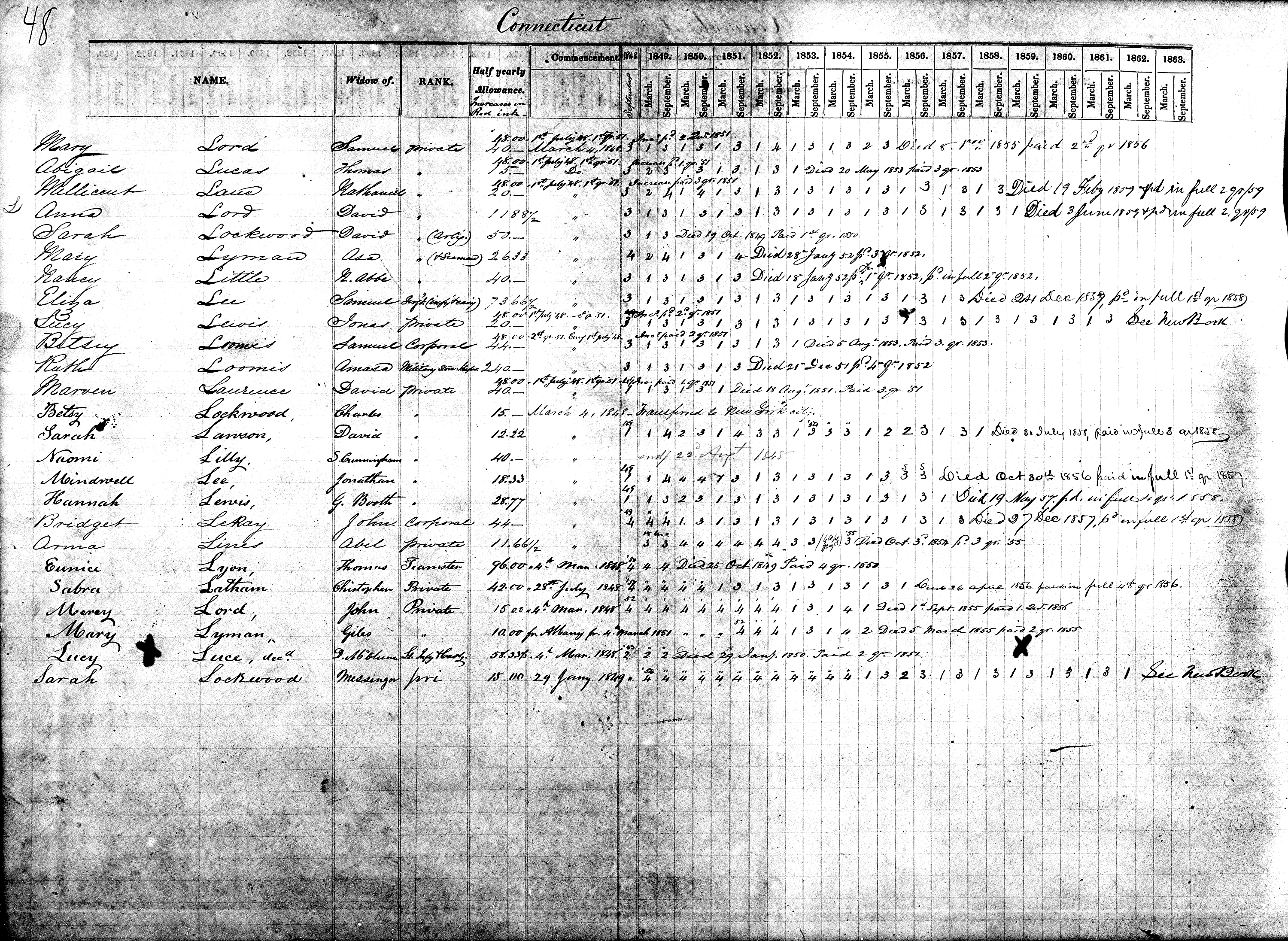 Beginning in September, 1836, Nancy (Moon) (Abbe) Little began receiving pension payments for the service of her first husband, Nathaniel Abbe. The payments ended upon her death in 1852.