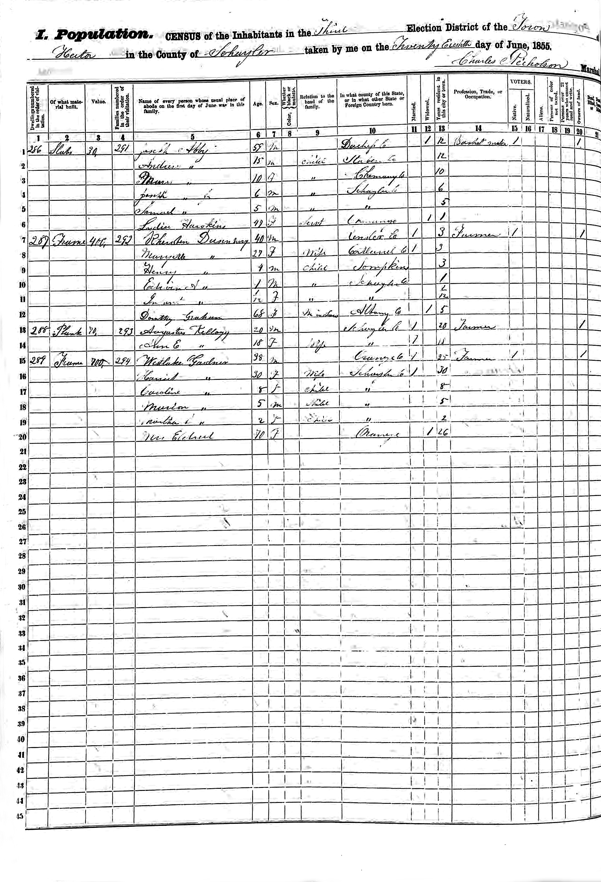 The 1855 New York State Census taken on June 28, 1855, shows Joseph Abby (age 59) born in Dutchess Co., NY, is a widower Basket Maker, and has lived in this city or town for 12 years, and who owns land, and is living in a slate house worth $30, in the Town of Hector, Schuyler Co., NY. Living with him are: a male child, Andrew Abby (age 15) born in Steuben Co., NY, and has lived in this city or town for 12 years; a female child, Mary Abby (age 10) born in Chenango Co., NY, and has lived in this city or town for 10 years; a male child, Joseph Abby Jr. (age 6) born in Schuyler Co., NY, and has lived in this city or town for 6 years; a male child, Samuel Abby (age 5) born in Schuyler Co., NY, and has lived in this city or town for 6 years; and a widowed Servant, Lydia Hawkins (age 47) born in Chenango Co., NY, and has lived in this city or town for 1 years.