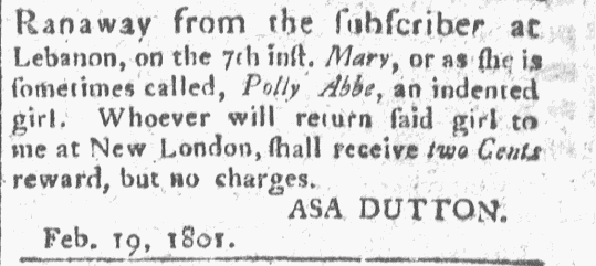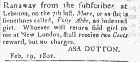 Mary "Polly" Abbey, an indented girl, ran away from Asa Dutton, the subscriber, in early 1801, in New London, CT. Asa Dutton was born October 30, 1755, in East Haddam, Hartford Co., CT, and died September 21, 1825, in Old Lyme, New London Co., CT (age 69).