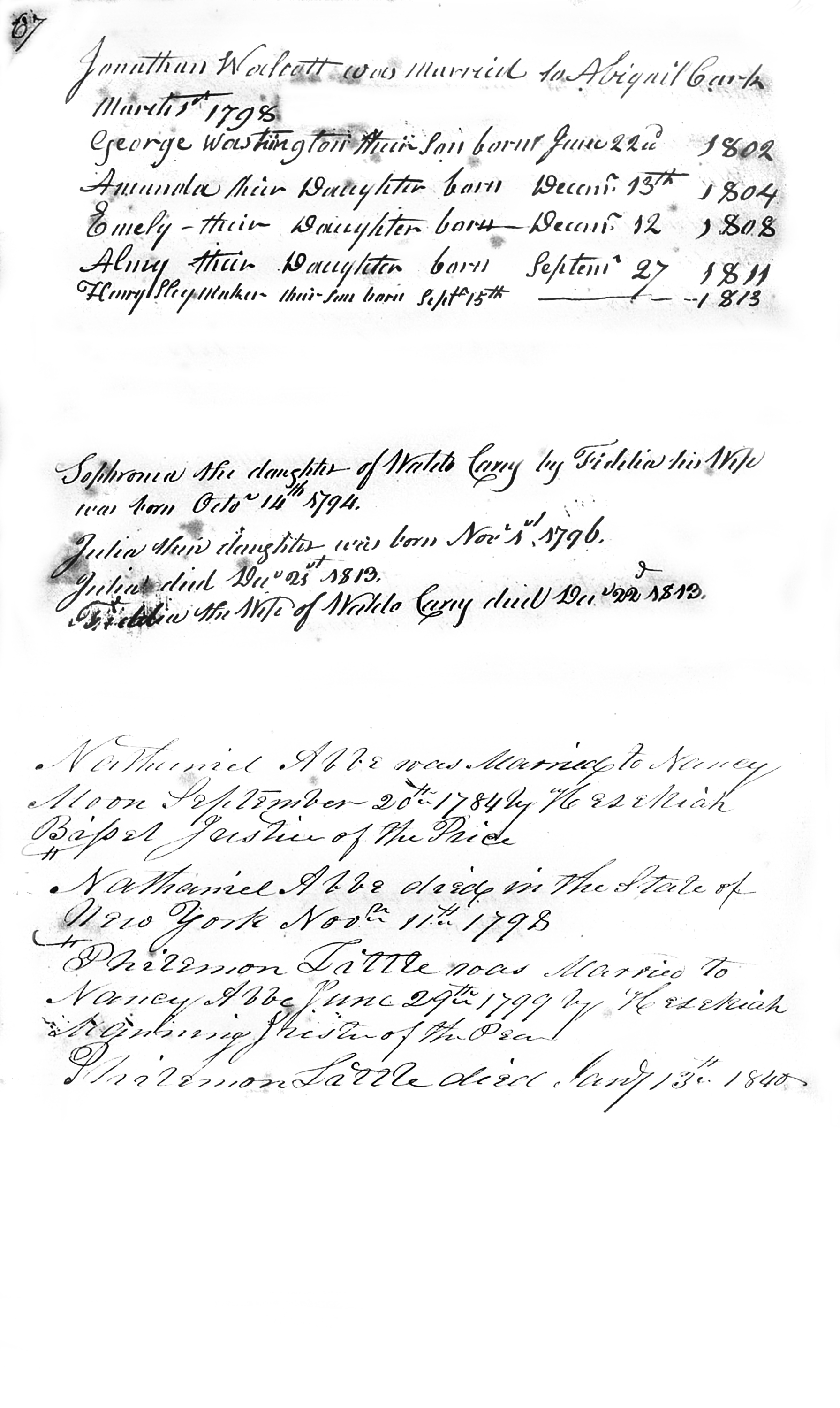 Nathaniel Abbey and Nancy Moon were married September 20, 1784, in Windham, Windham Co., CT, by Hezekiah Bissell, J.P.