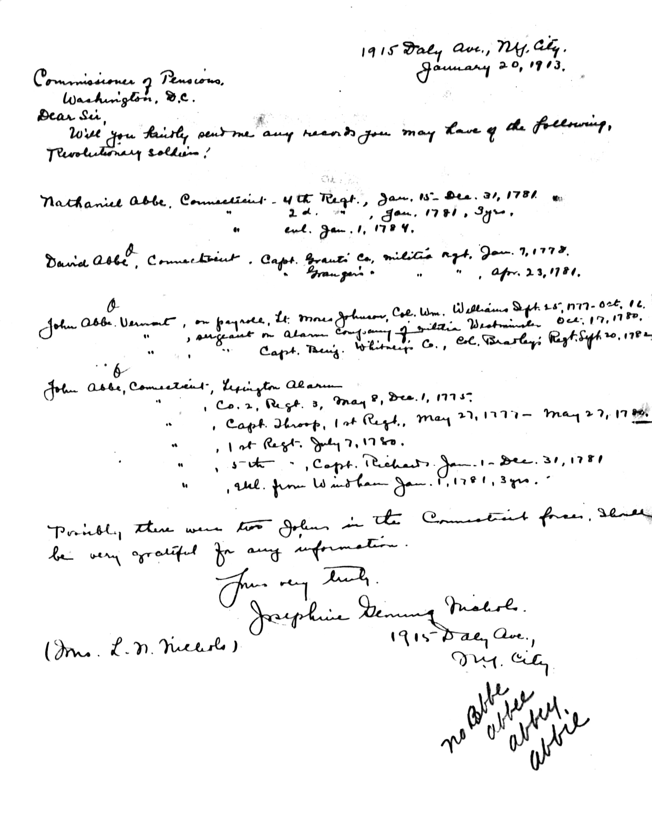 Nathaniel Abbey (age 15) enlisted January 15, 1781, as a Private in the 4th Connecticut Regiment, with expiration of service December 31, 1781, for a term of 11 months and 16 days. 15 Captain Potter's company, in Col. Butler's regiment. Nancy (Moon) (Abbe) Little believes he served three years, and must have left the army in the year 1783 as she was married in the year 1784. He marched at Fishkill and Perkins hill, when they had a skirmish with the British at Dobbs Ferry. Pomp McCuff served with Nathaniel Abbe in the same unit.