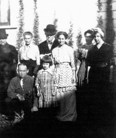 Mary Jane (Abbey) (Mallard) Jones and Mallard families, about 1916, Stockton, San Joaquin Co., CA . Charles T. Jones is standing on the left, next to his wife, Mary Jane (Abbey) (Mallard) Jones . Family Gathering at the Miller's home, 935 N. Commerce St., Stockton, San Joaquin Co., CA. Top row, left to right: Charles Jones; Mary Jane Jones; George Mallard; Jodie Miller; Teresa Mallard; Audria Mallard. Front row, left to right: Frank Mallard; and Frances Mallard.