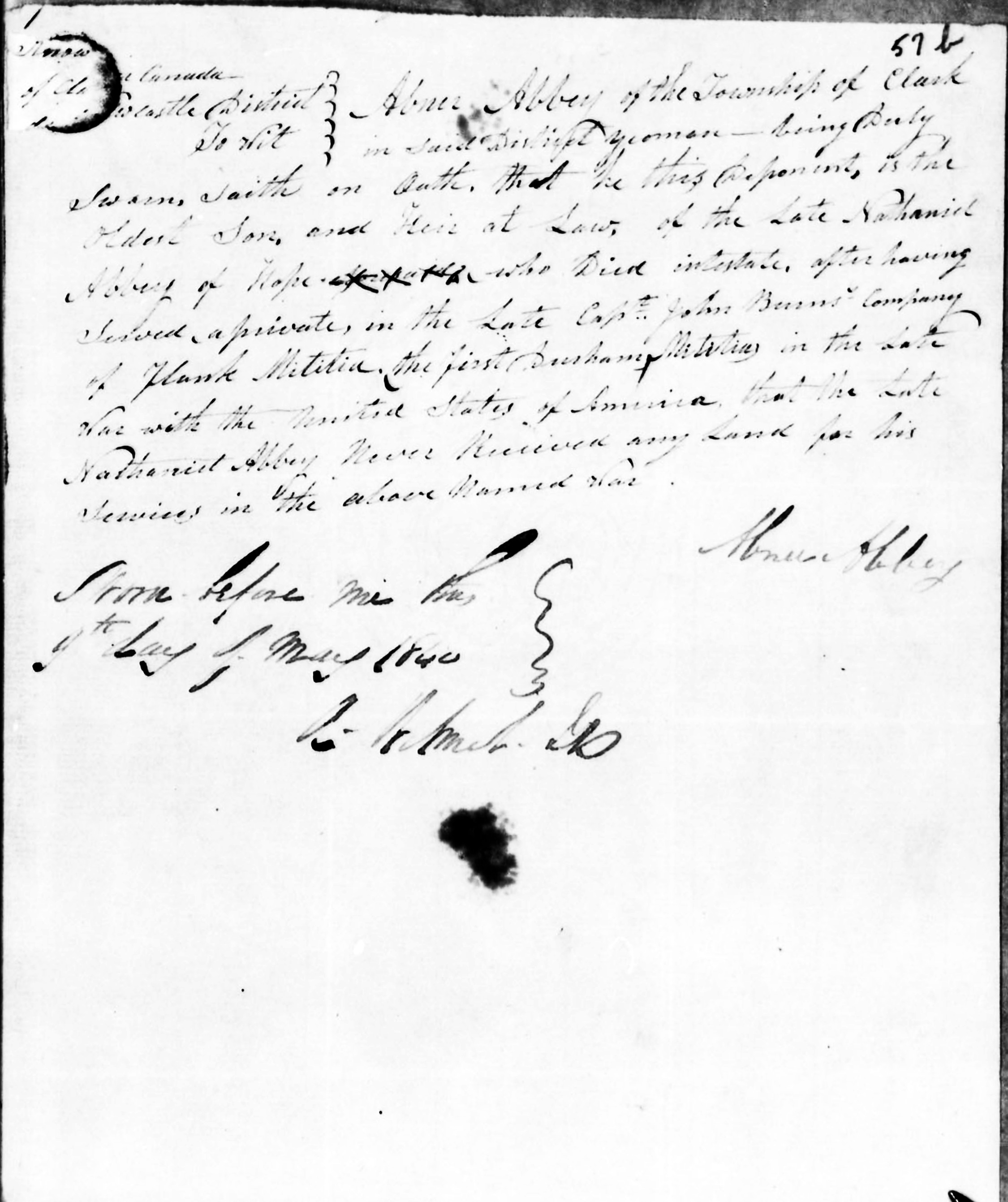 Miscellaneous 1840 Land Records for Nathaniel Abner Abbey, based upon his father never having received a Land Claim for his service.. Thanks to Kay Koslan for locating these records.