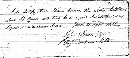 The 1808 Census for Haldimand Twp., Northumberland Co., Upper Canada, shows Oliver Nathan Bradley is the Head of Household. There are 1 Male age 16 - 60; 2 Males under age 16; and 1 Female age 16 - 60.