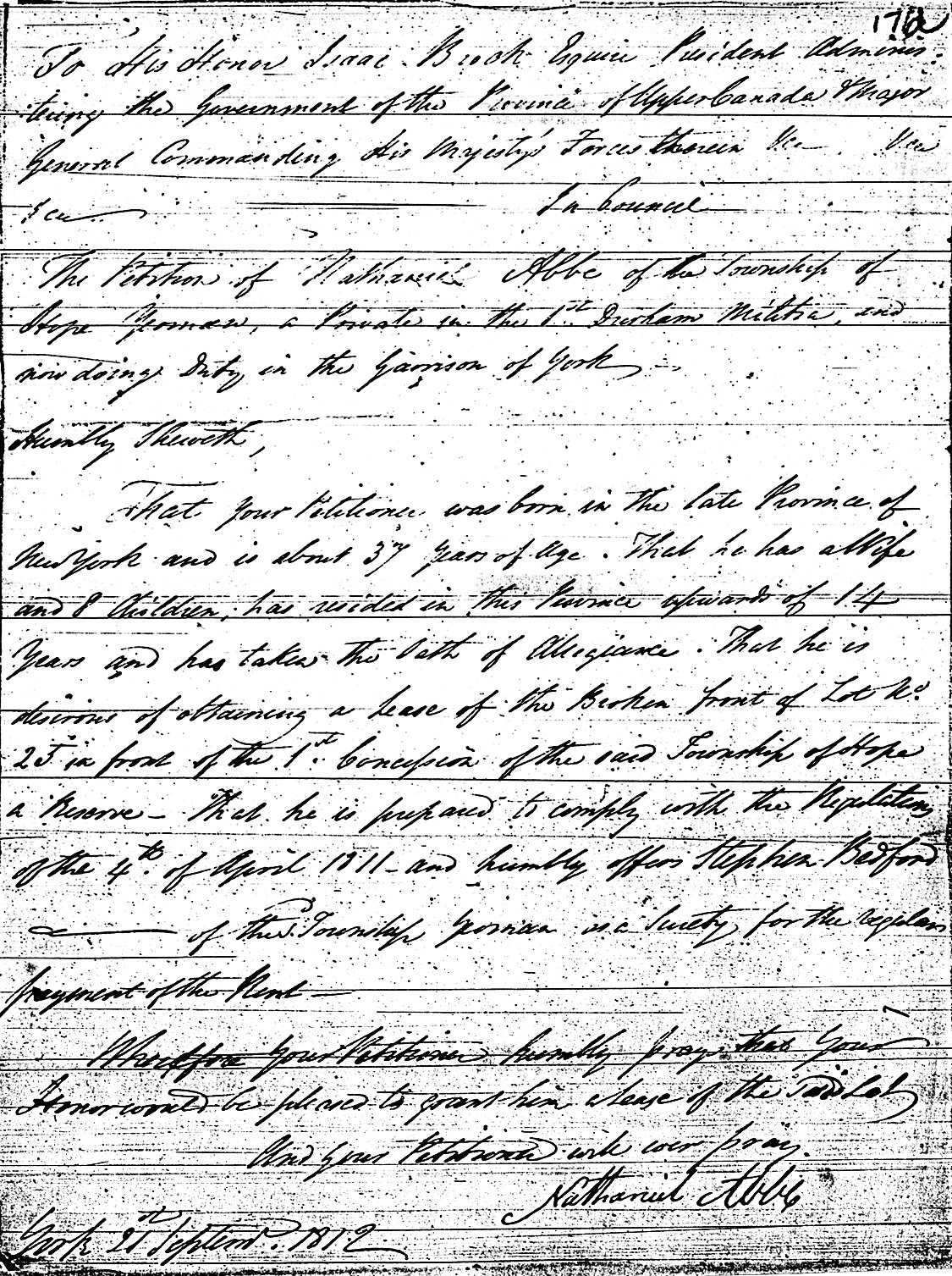 On September 21, 1812, Nathaniel Abbey petitioned for a lease on the broken front of Lot No. 25, in front of the 1st Concession of Hope Township, a Reserve.