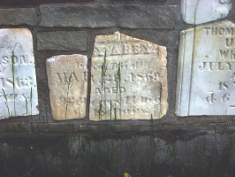 The original Mary "Polly" (Winters) Abbey Grave marker, now embedded in a memorial wall. Buried in Port Oshawa Pioneer Cemetery, Oshawa, Durham Regional Municipality, Ontario, Canada. Thanks to Find-A-Grave for making this image available.