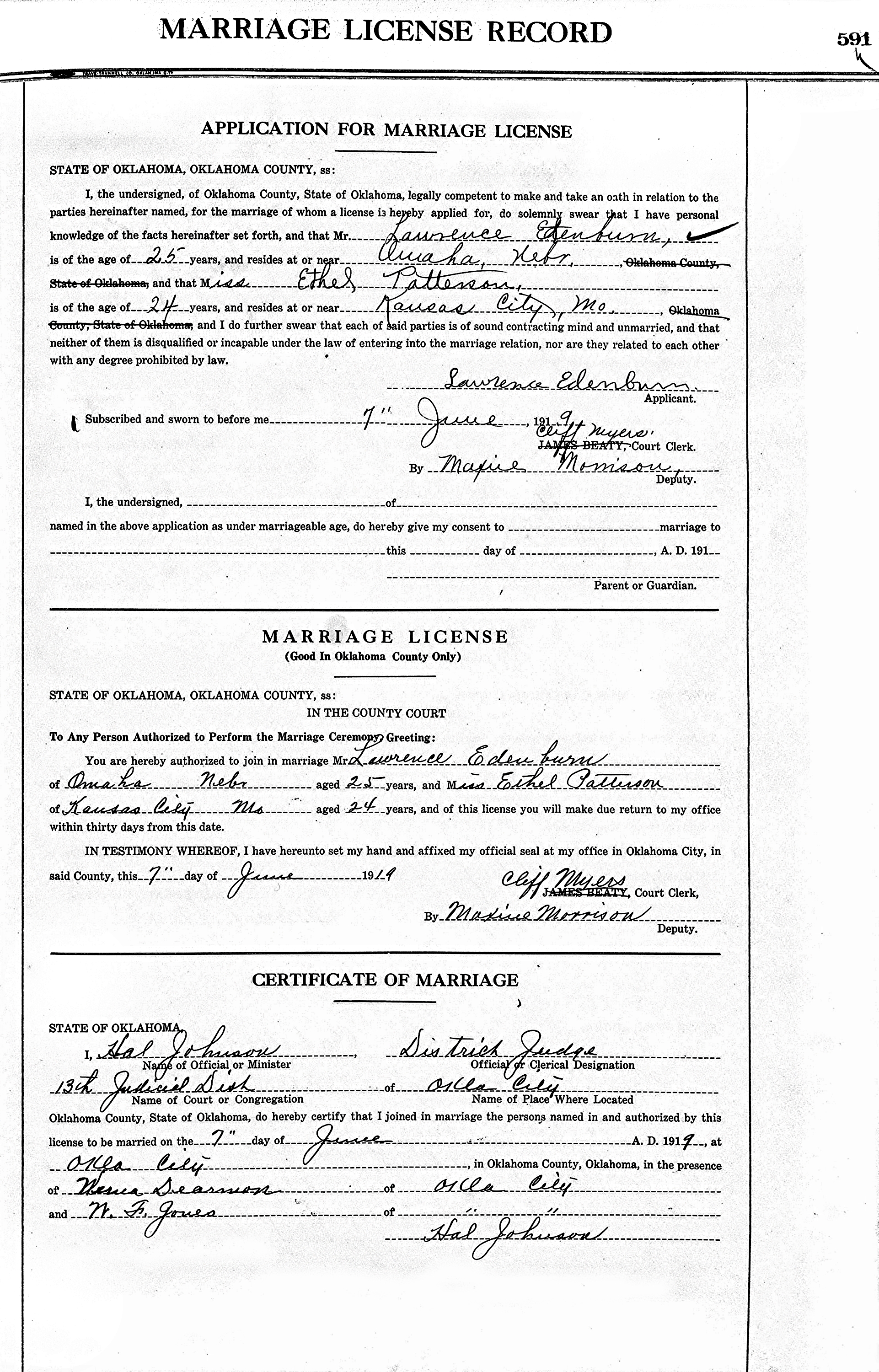 June 7, 1919, in Oklahoma City, Oklahoma Co., OK, to Ada Ethel Patterson: Born