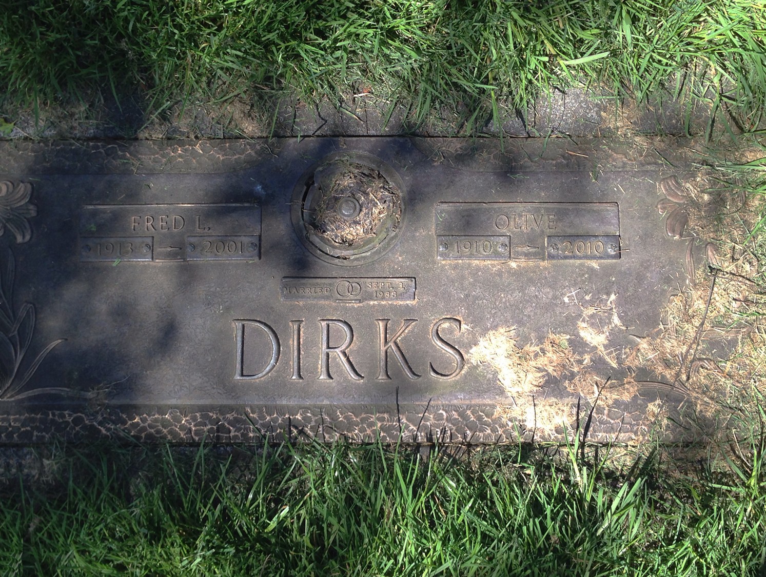 Fredrick Leonard "Fred" Dirks and Olive Sophia (Nelson) (Goodman) (Lull) Dirks are buried in Evergreen Memorial Gardens, Vancouver, Clark Co., WA. Thanks to Find-A-Grave for making this image available.